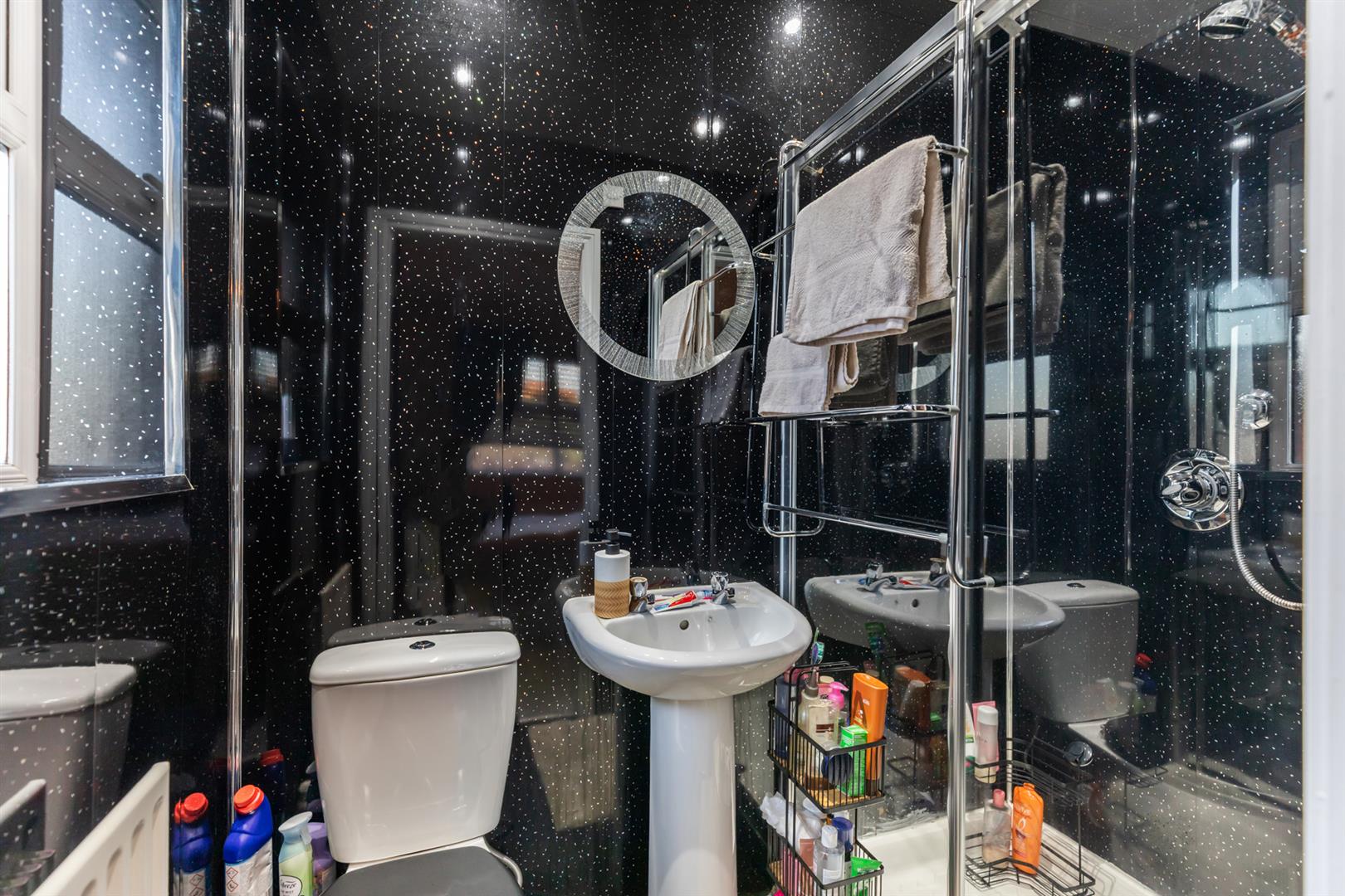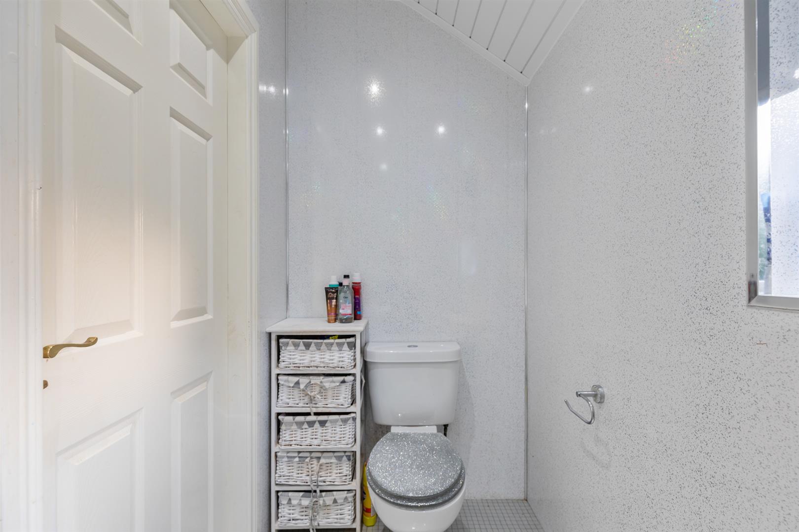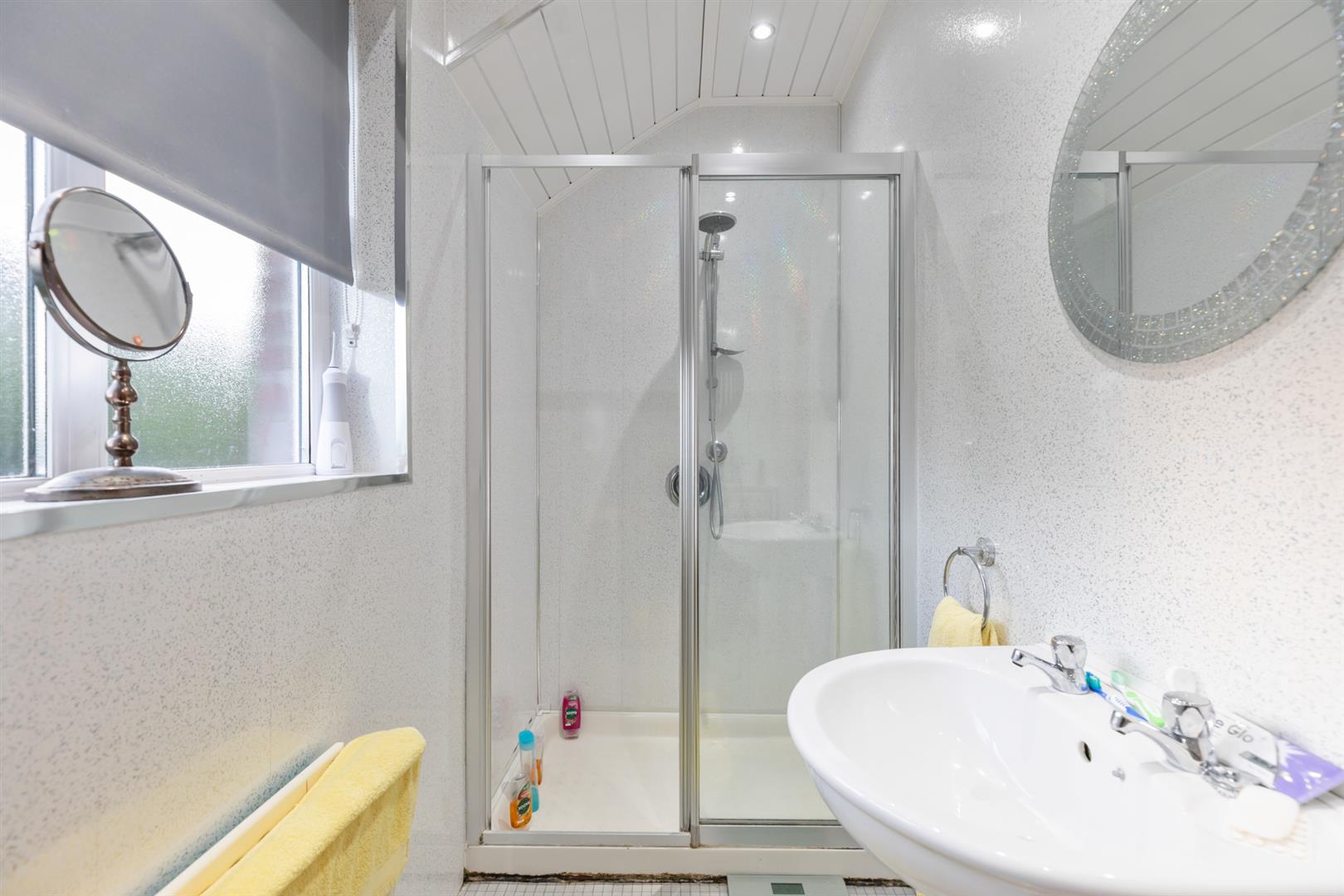 Modern bathroom suite comprising walk-in shower, thermostatically controlled drench shower unit, pedestal wash hand basin, low flush wc, double panelled radiator, pvc panelled walls, pvc ceiling, recessed lighting.
