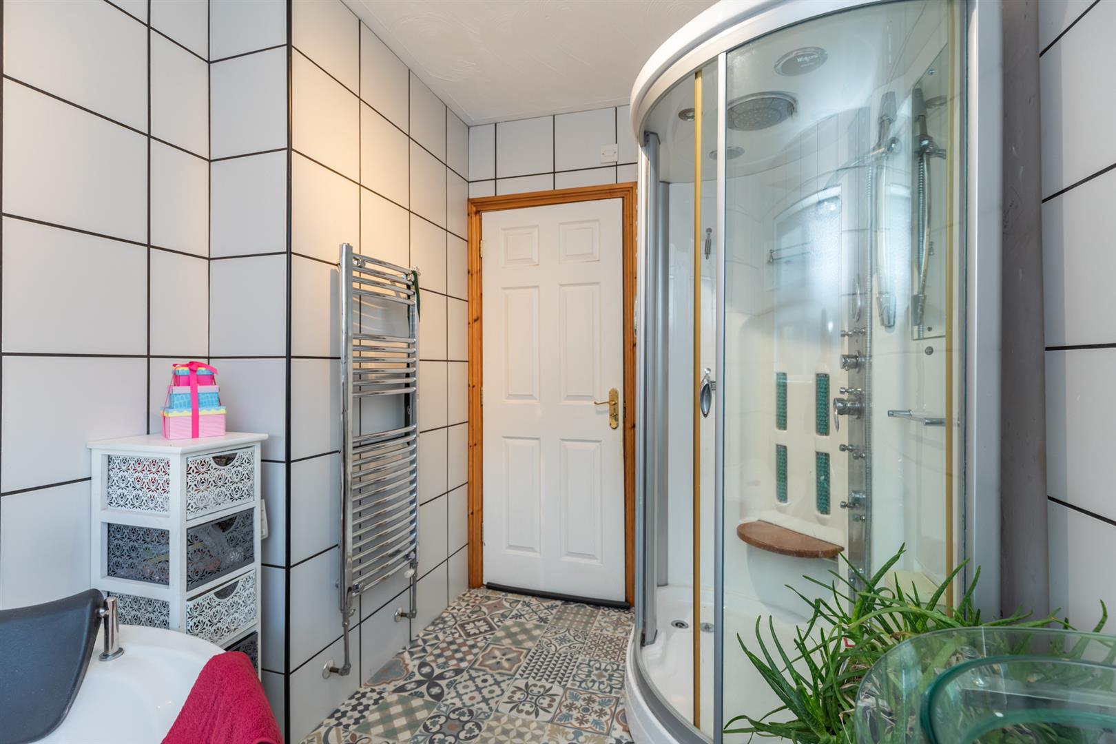 Deluxe fully tiled white 4 piece bathroom suite comprising jacuzzi style corner bath, walk-in shower cubicle, thermostatic controlled drench style shower unit, body jets, built-in radio, glass pedestal wash hand basin, low flush wc, ceramic tiled floor, chrome radiator, extractor fan.
