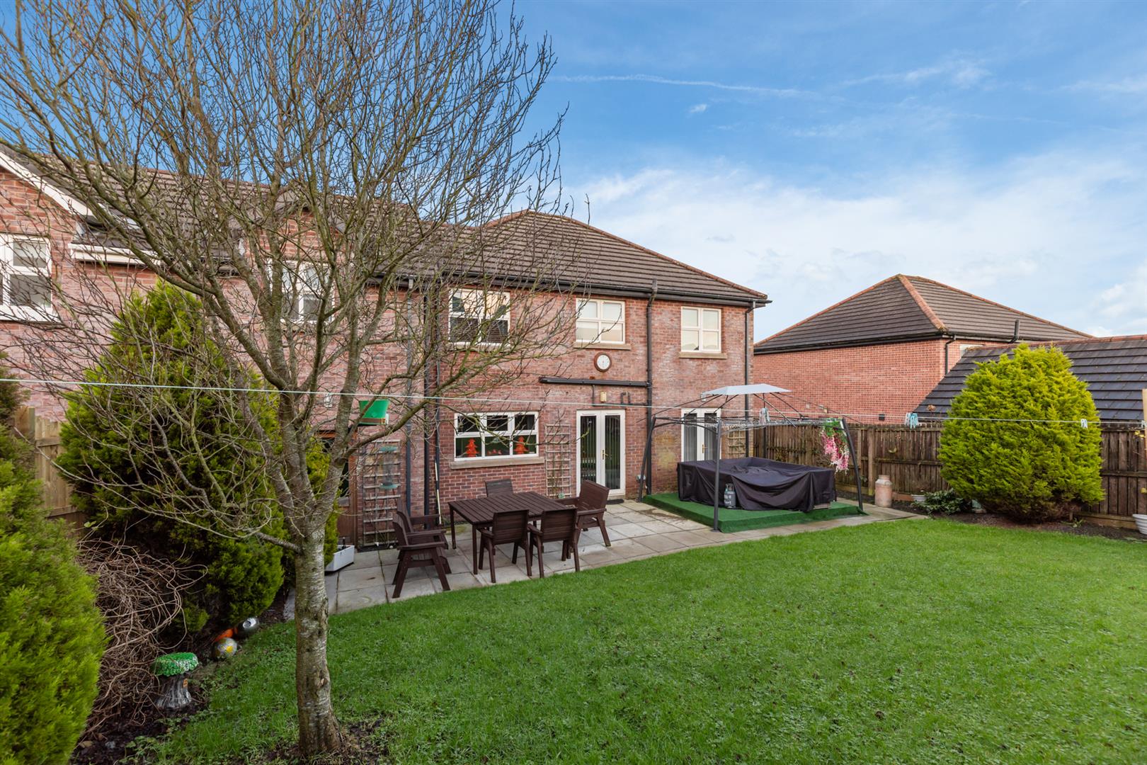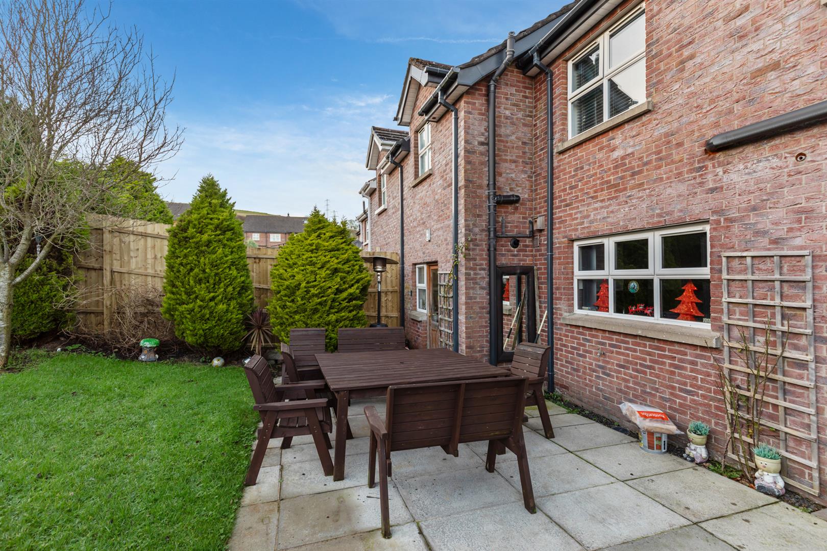 Ample driveway parking. Elevated front garden in mature lawn. Southerly facing rear in mature lawn, patio, raised bar-be-que area in artificial grass, outside light and tap.