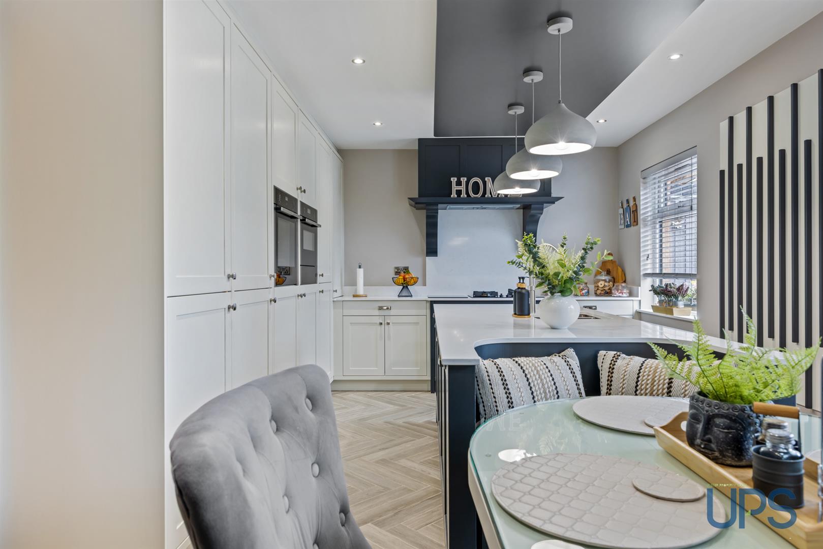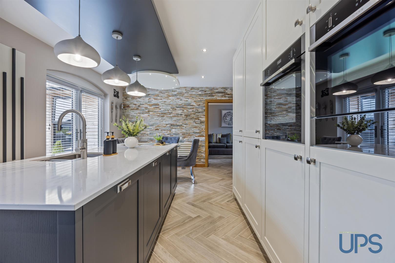 On the ground floor, a spacious and welcoming entrance hall sets the tone, complete with an attractive herringbone tiled floor that flows throughout much of the level, along with a convenient downstairs W.C. There is a bright living room with bay window and bespoke media wall, alongside a second reception room, also featuring a bay window. The standout feature of the home is the stunning, upgraded luxury kitchen, complete with quartz worktops, feature island with integrated seating, and spotlighting, all open plan to a generous dining area-ideal for modern living and entertaining. A separate utility room is accessed from the family room.