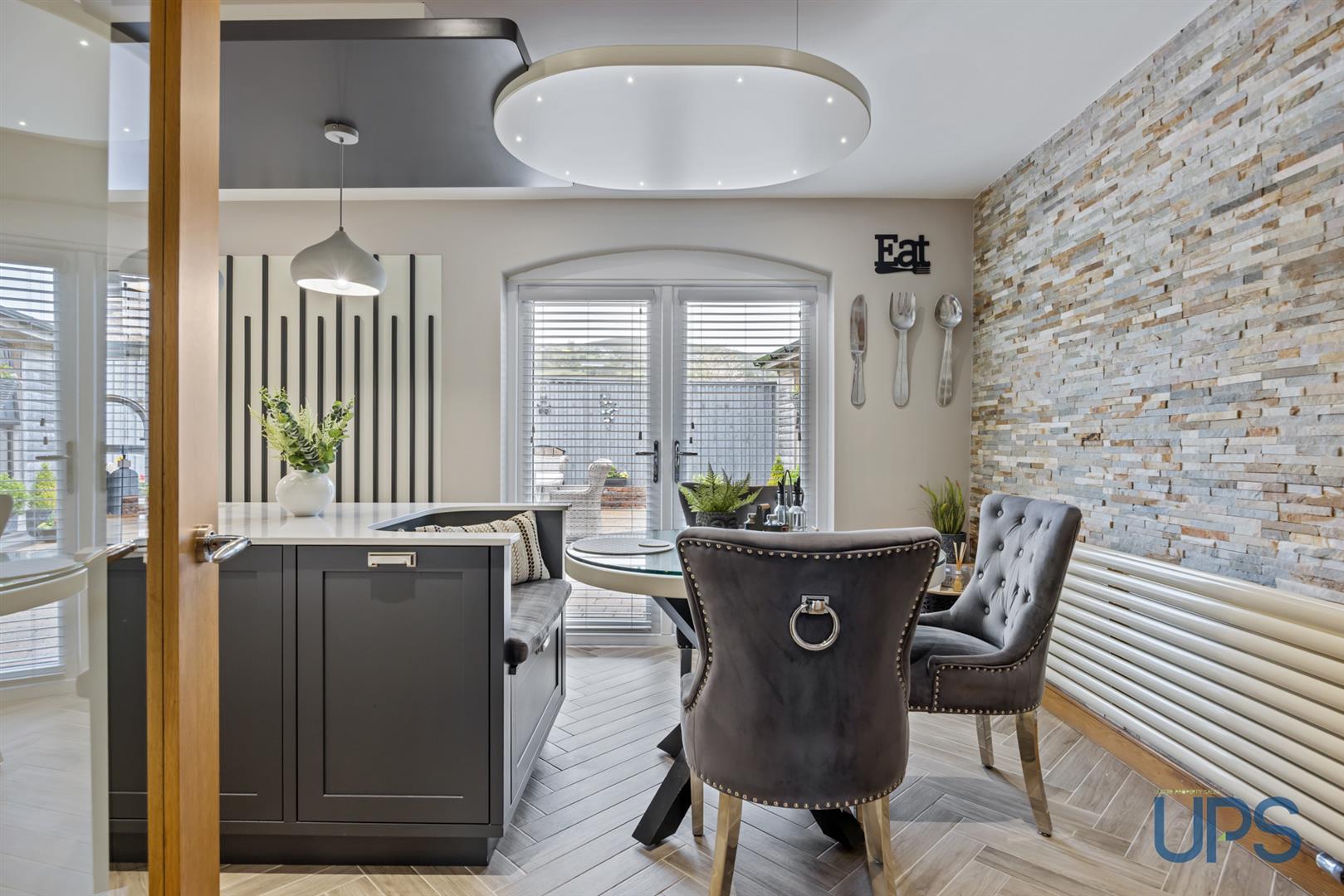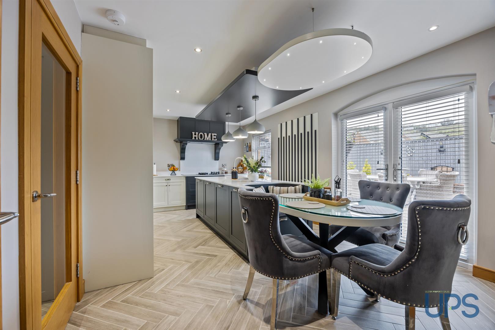 An eye-catching, high-quality kitchen featuring a striking island with a built-in single-drainer stainless-steel 1½ bowl sink and an integrated seating area at the end. There is an excellent range of high- and low-level units with quartz worktops and splash back, a modern high-quality combined gas and induction hob with extractor canopy, built-in oven, and integrated fridge freezer, along with a Quooker boiling water tap. Recessed spotlights and a beautiful herringbone-effect tiled floor that continues from the hallway enhance the space, which opens seamlessly into the dining area. uPVC double-glazed double doors provide access to privately enclosed, well-maintained gardens.