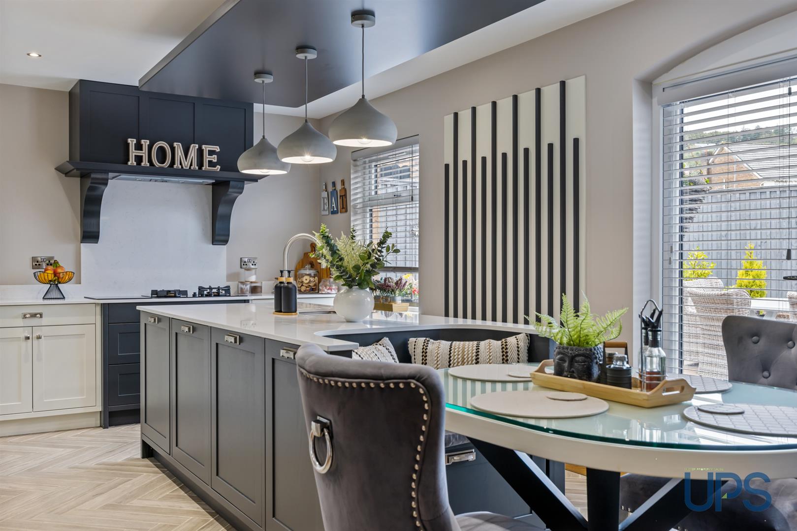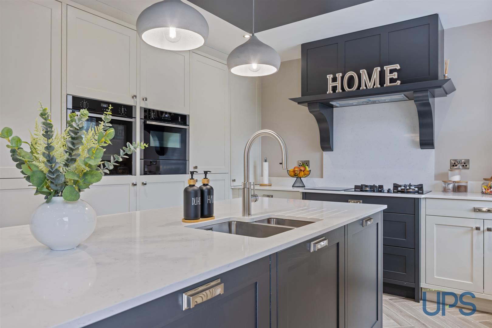 A showstopping, upgraded luxury fitted kitchen finished to a high standard, featuring a central island, Quooker boiling water tap, and a modern high-quality Zug combined gas and induction hob with ext