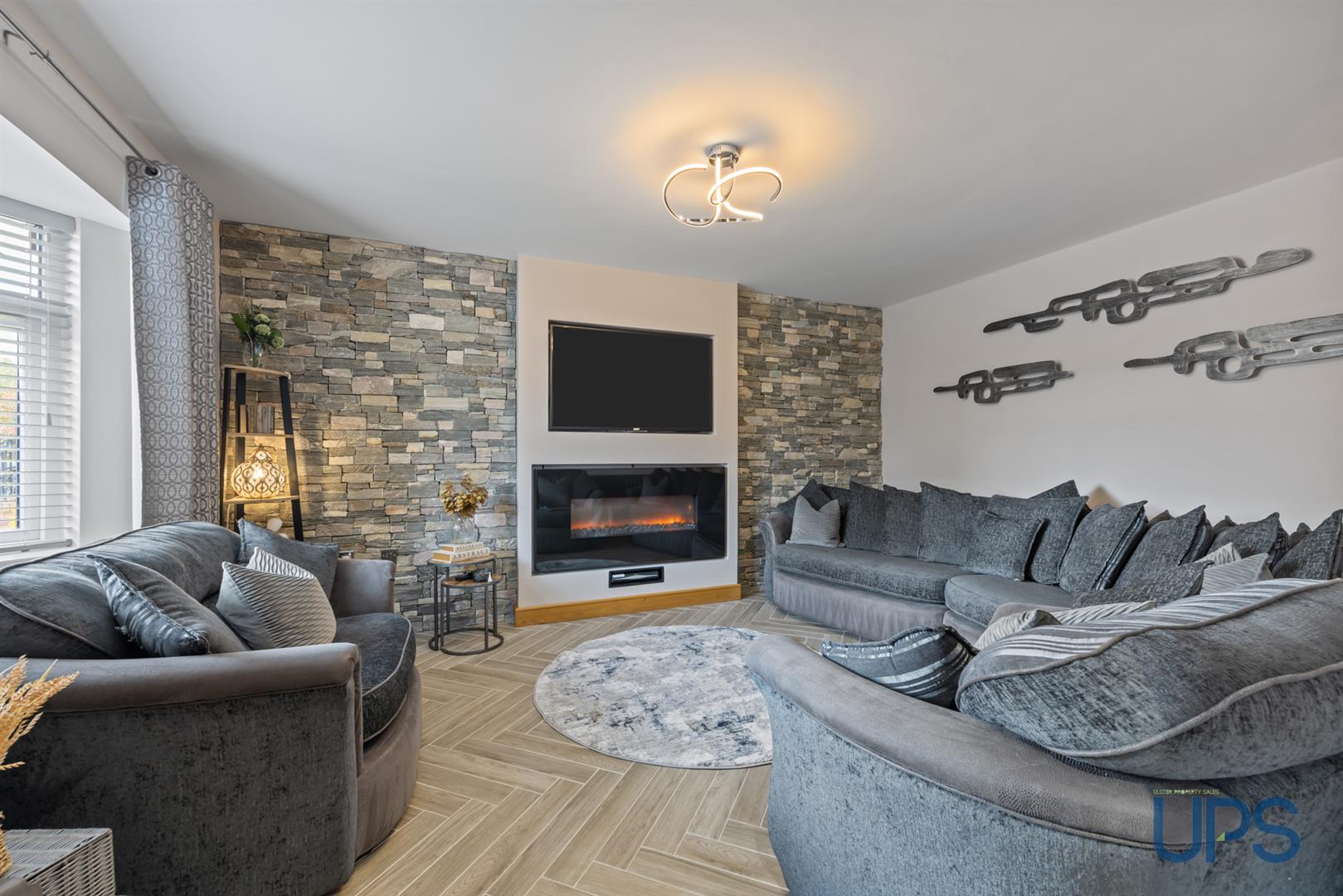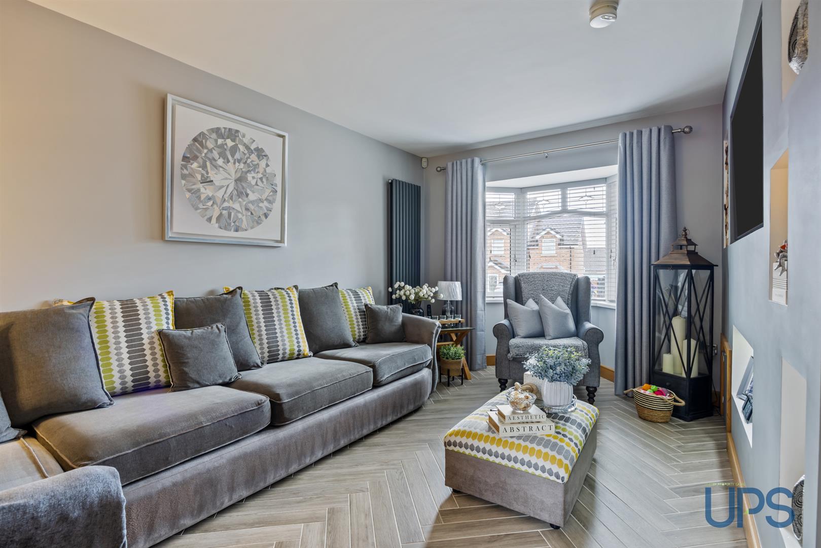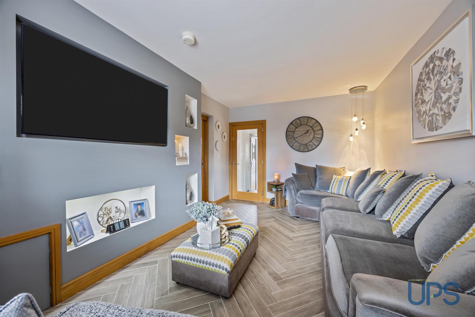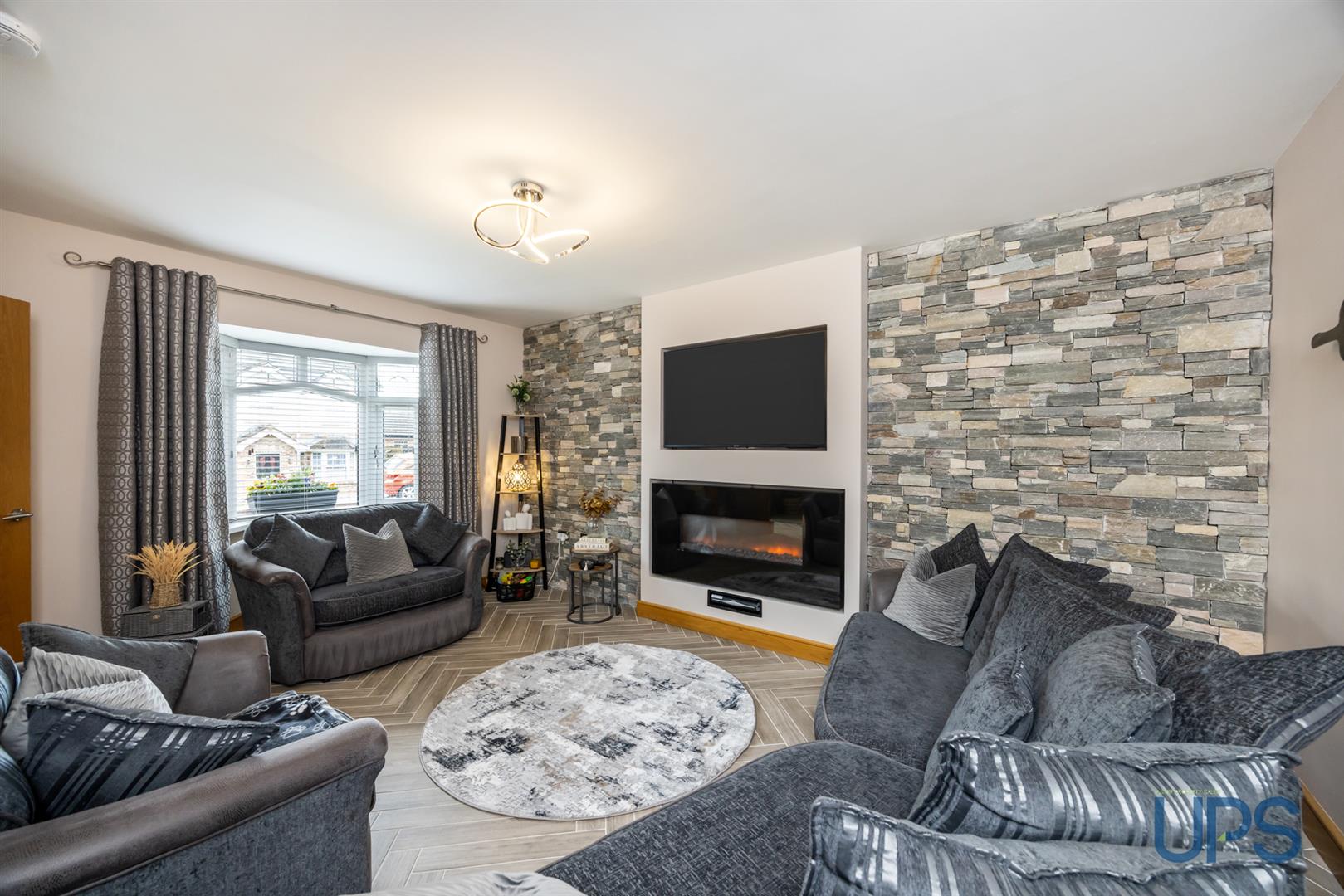 Featuring a beautiful herringbone-effect tiled floor that continues from the hallway, a bay window, a media wall, and an inset electric fire.