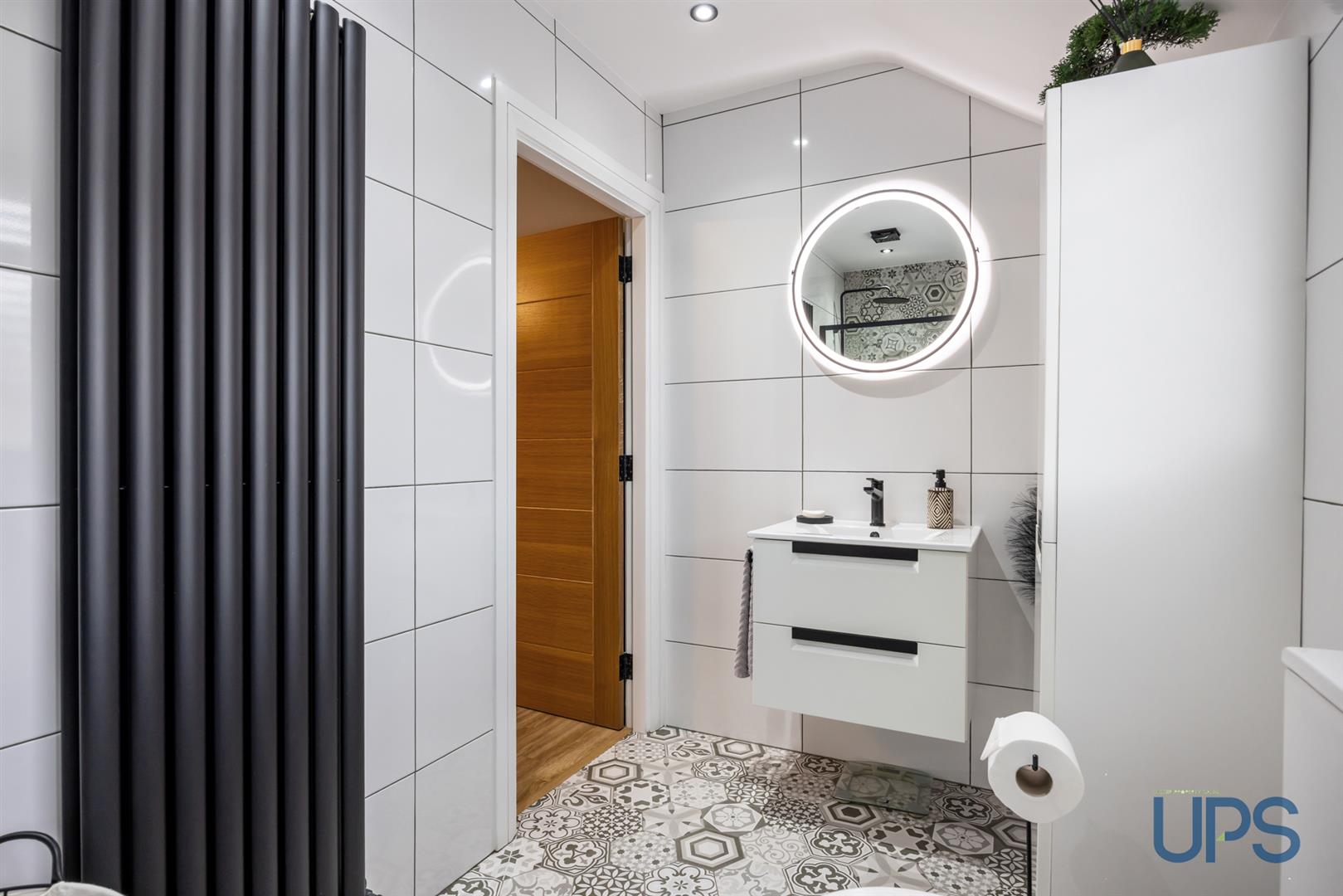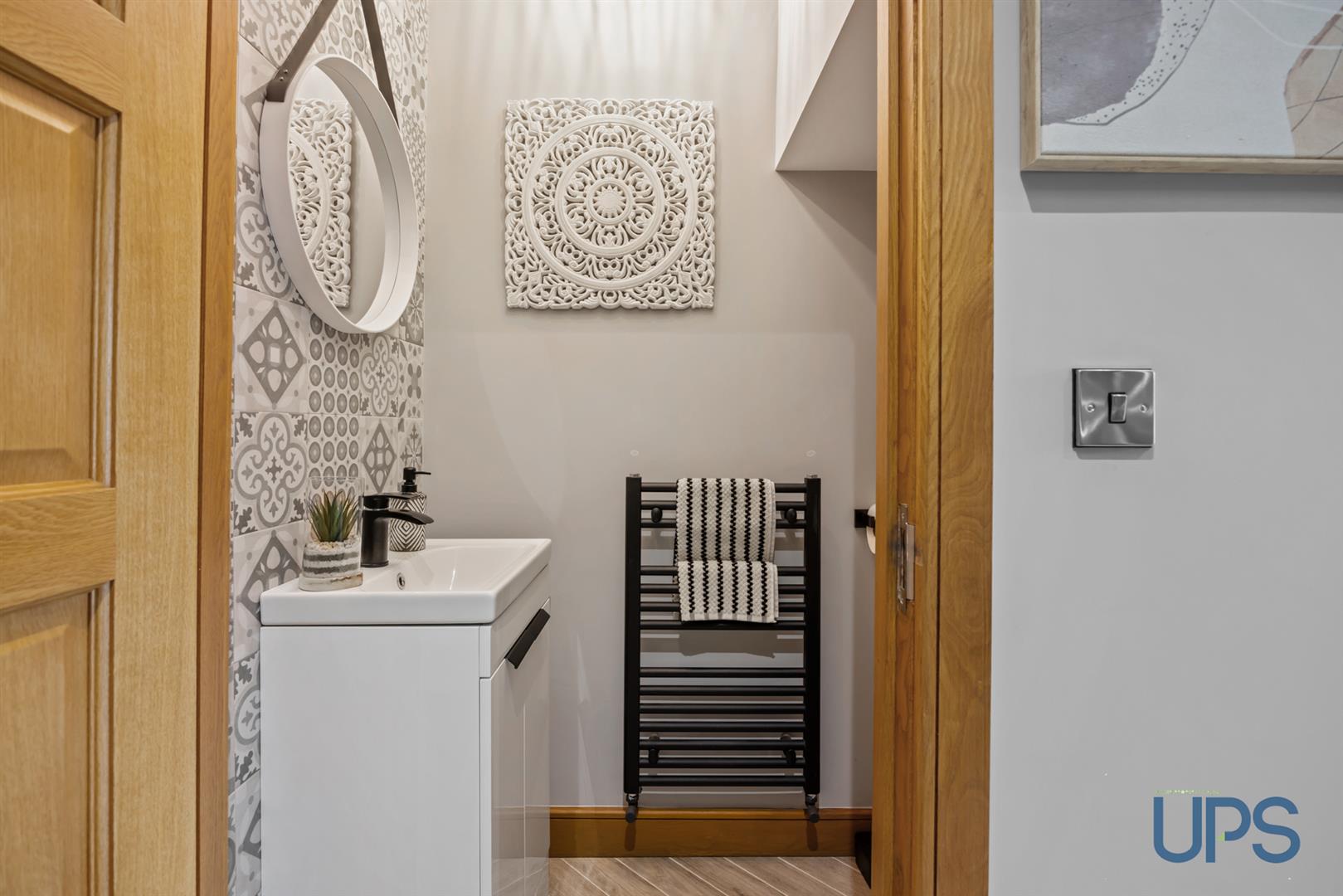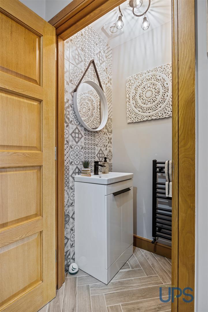Low-flush W.C. and wash hand basin with integrated storage unit, complemented by black-effect sanitary ware and a matching black-effect towel warmer. The room features a beautiful herringbone-effect tiled floor and an extractor fan.