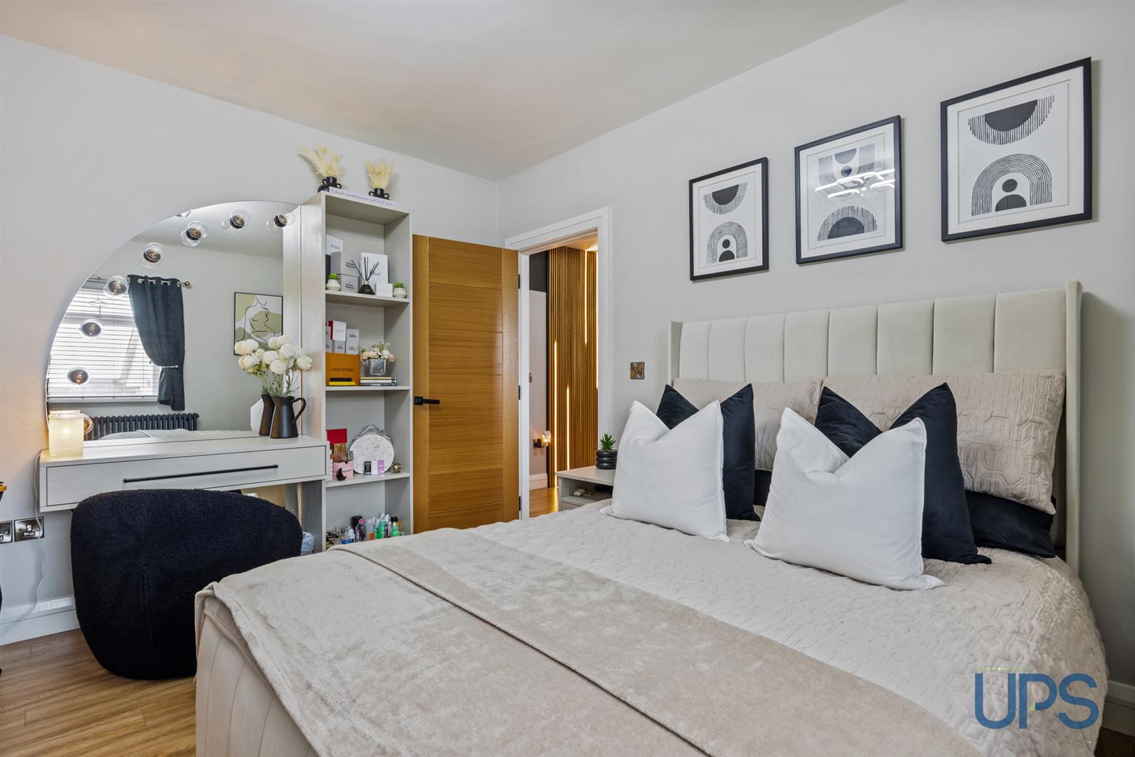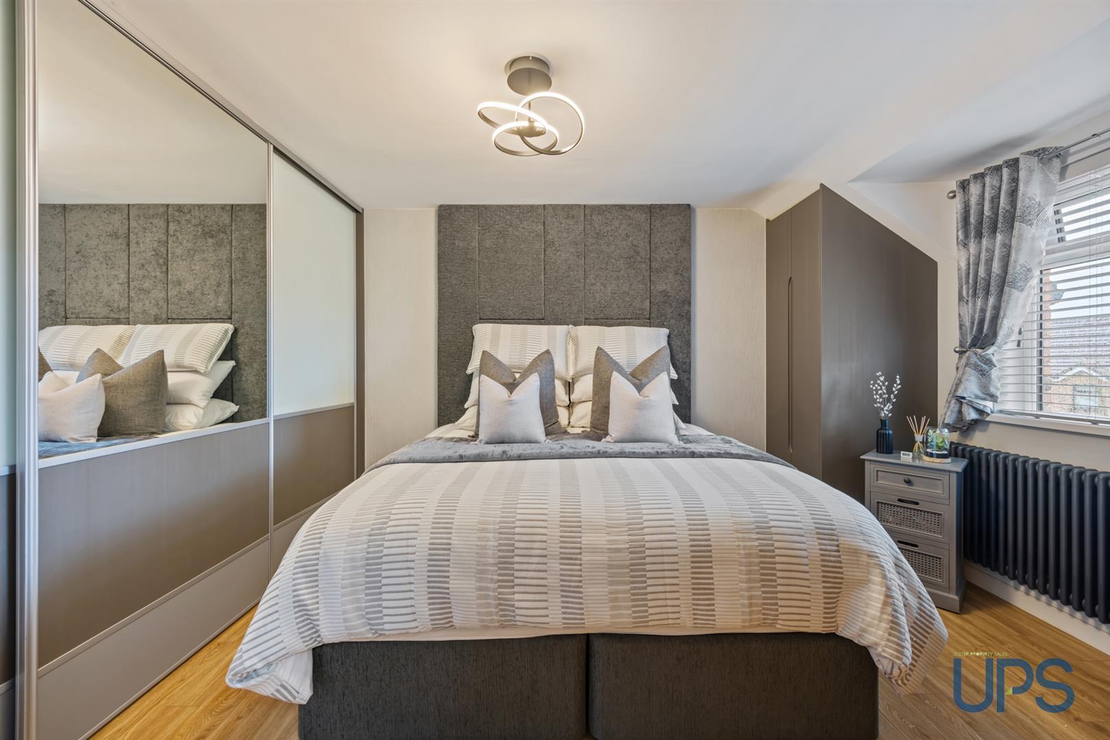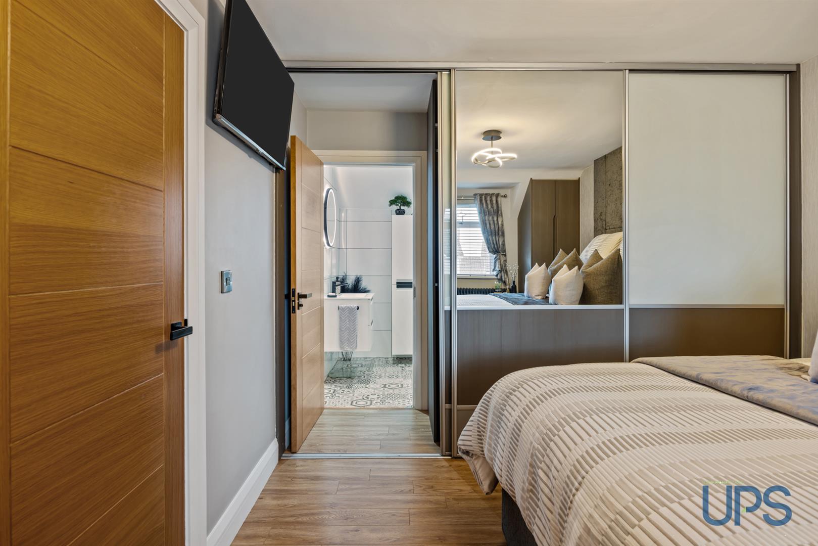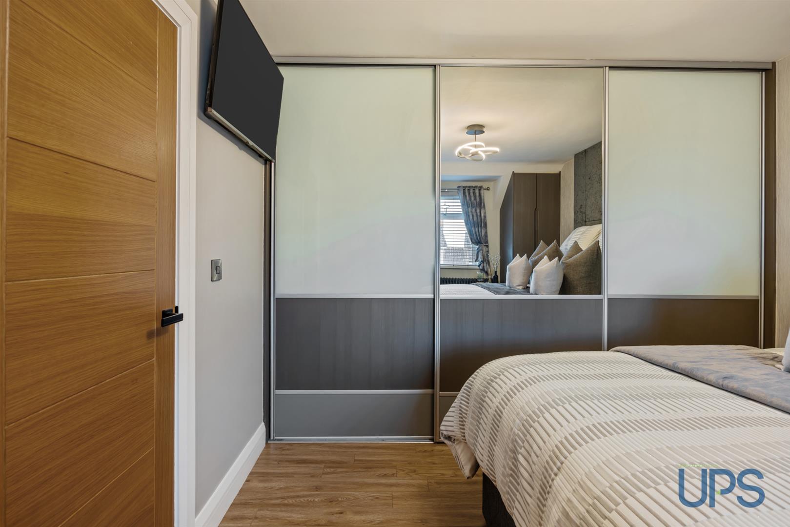 Wooden-effect stripped floor, contemporary built-in wardrobes, with access to the roof-space area via a pulldown ladder, and additional built-in slide wardrobes featuring a concealed entrance to;