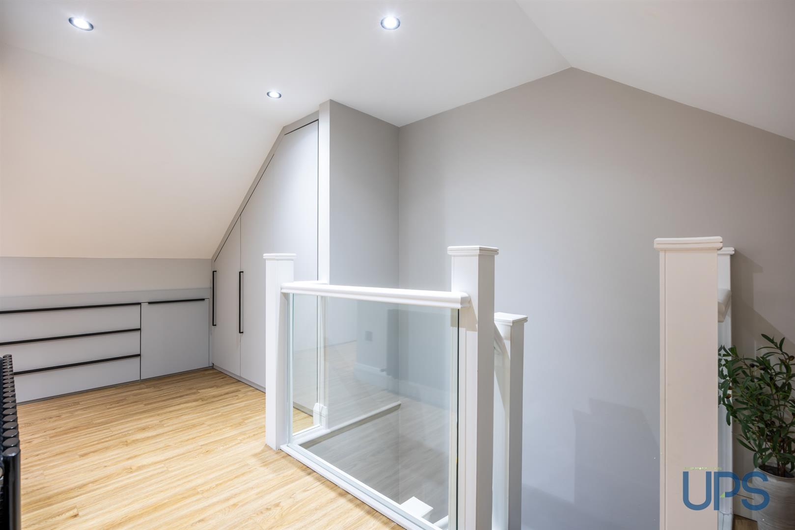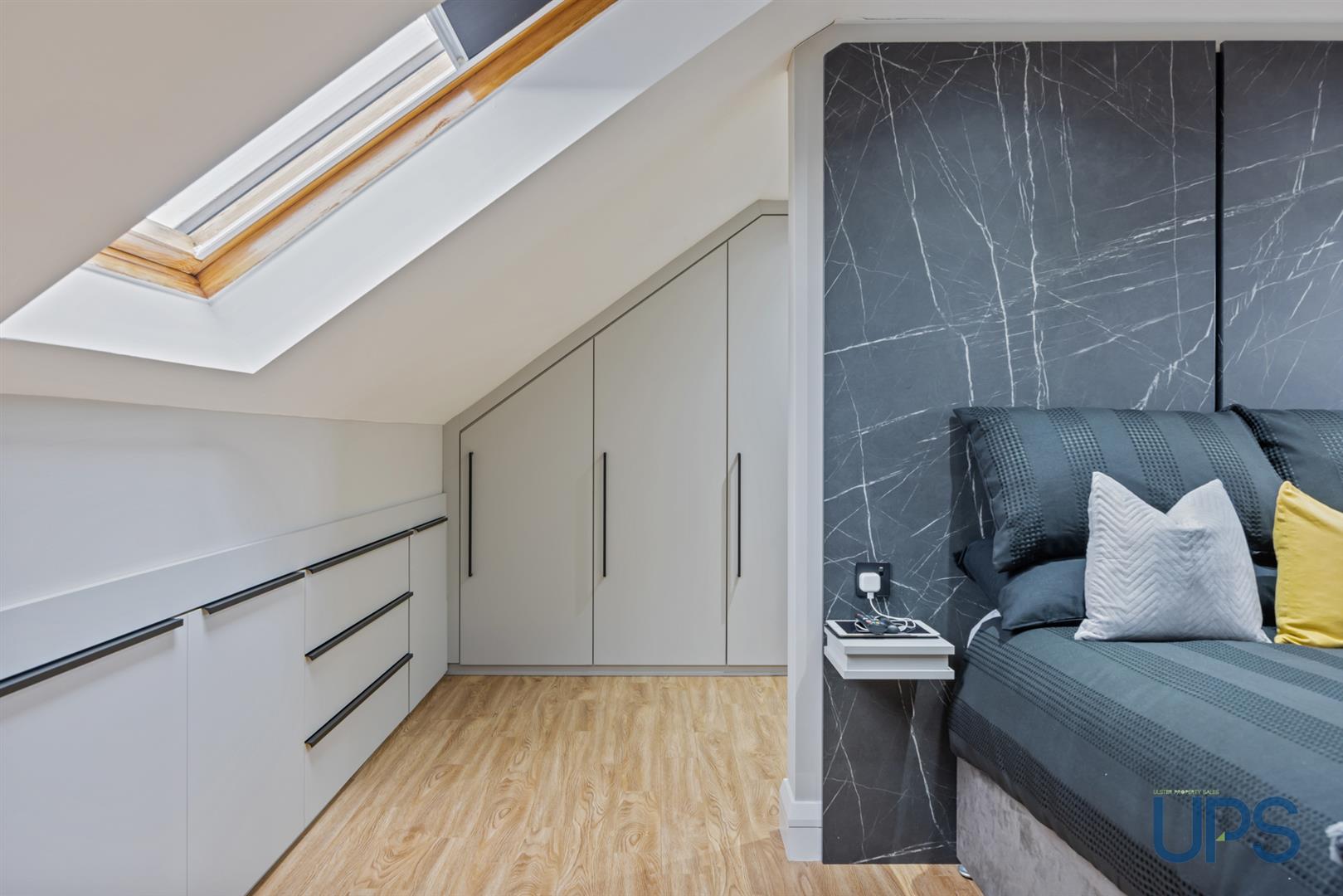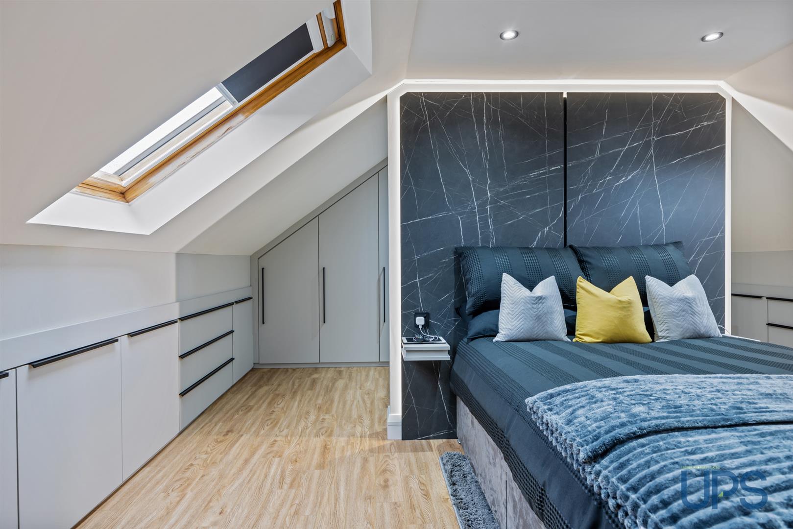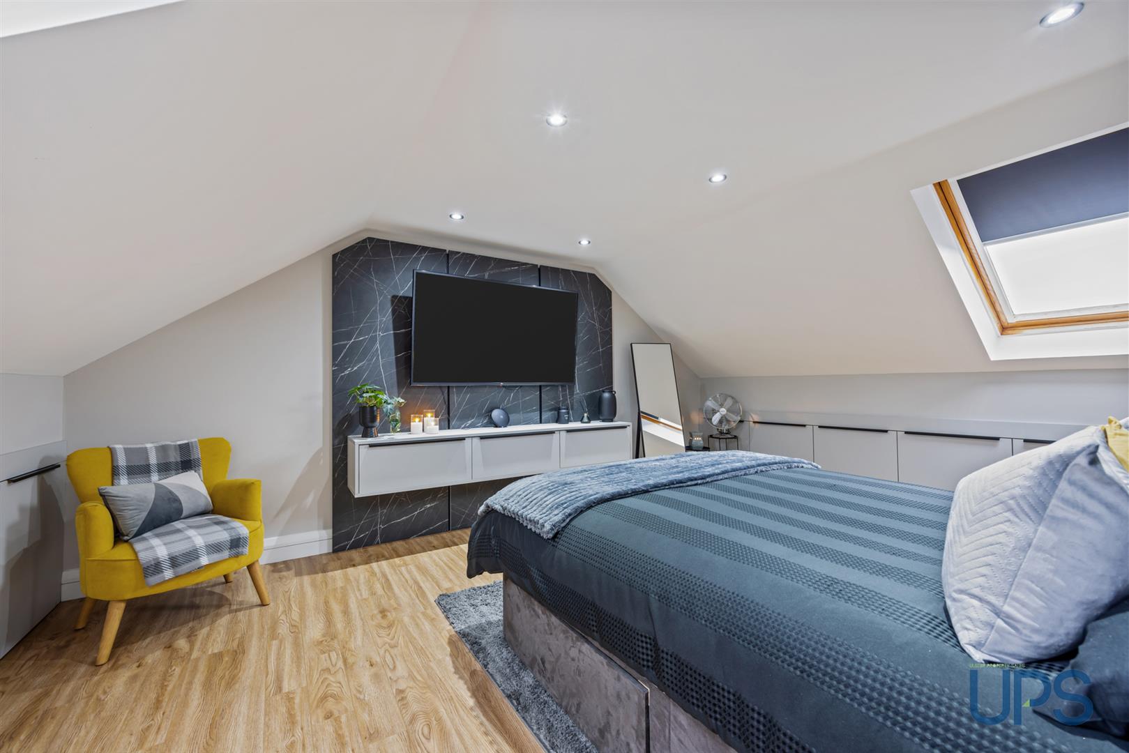 Fantastic large room with wooden-effect stripped floor, beautiful views, recessed spotlights, and built-in storage into the eaves. Keylite windows enhance the natural light and overall sense of space.