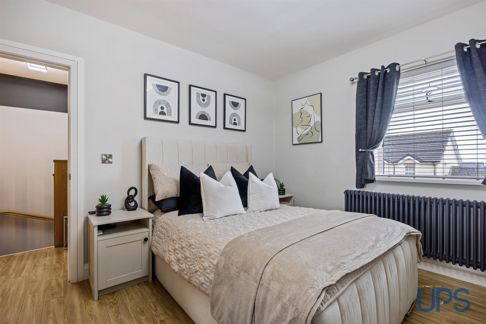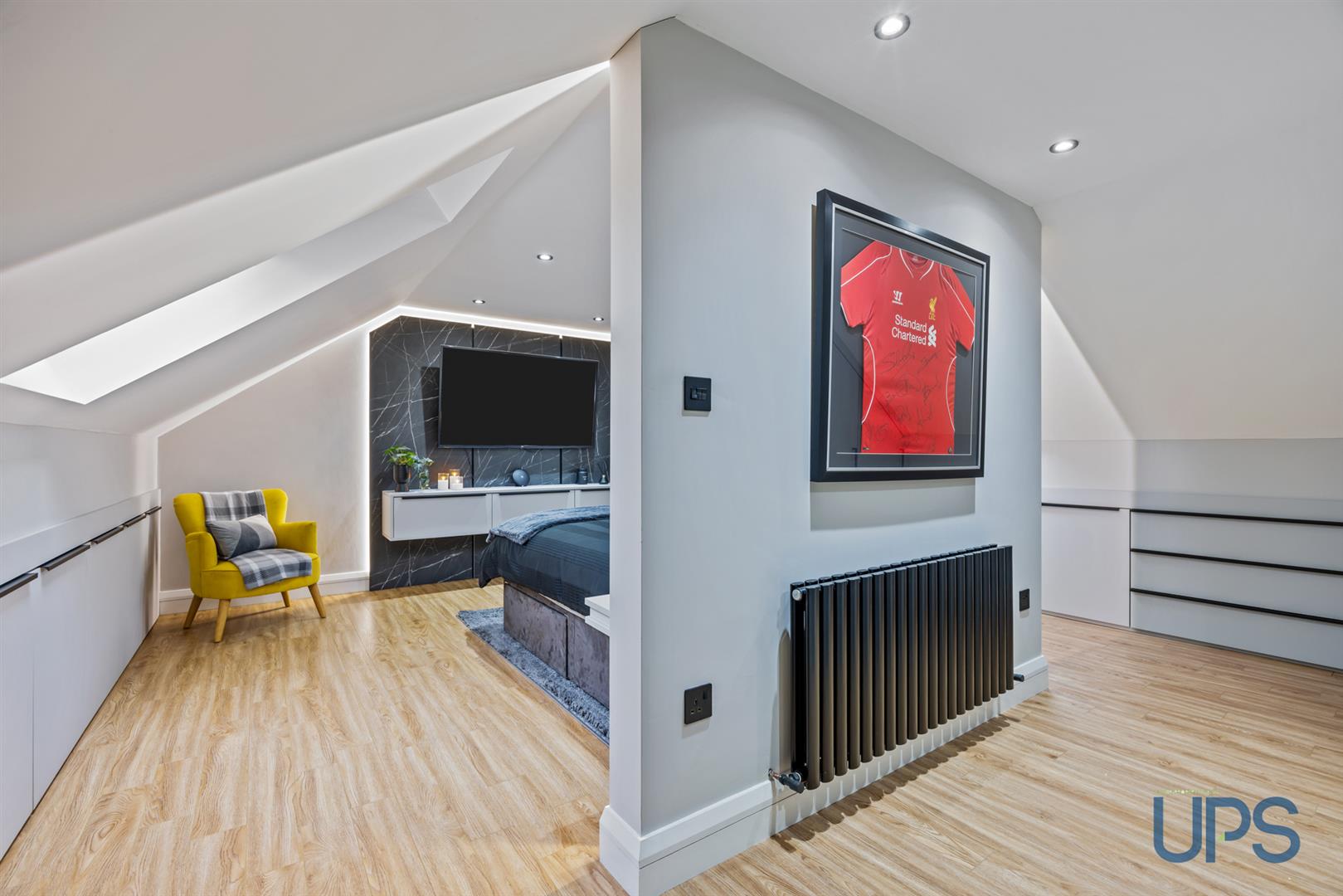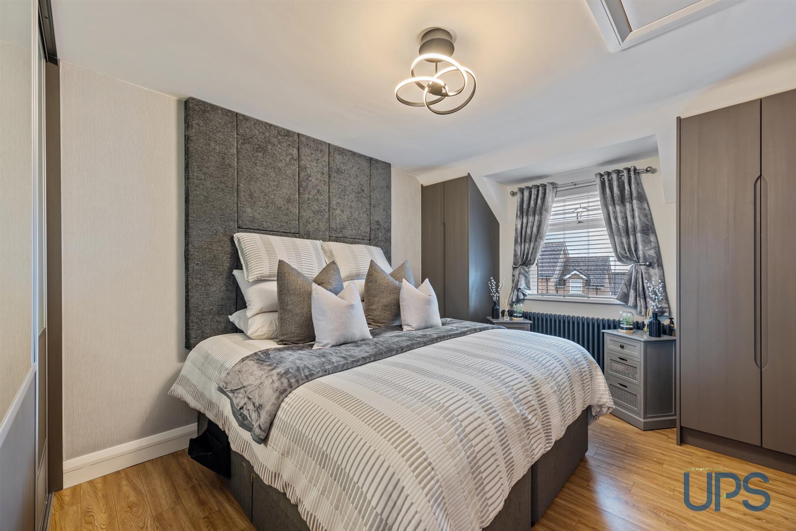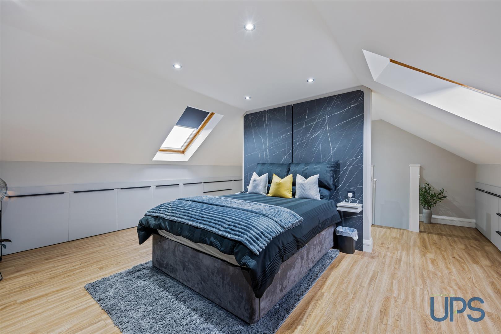 Fantastic large room with wooden-effect stripped floor, beautiful views, recessed spotlights, and built-in storage into the eaves. Keylite windows enhance the natural light and overall sense of space.