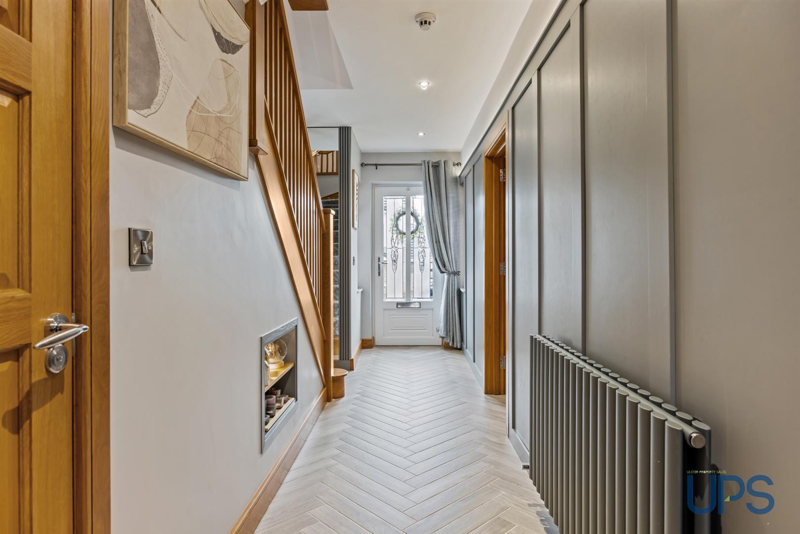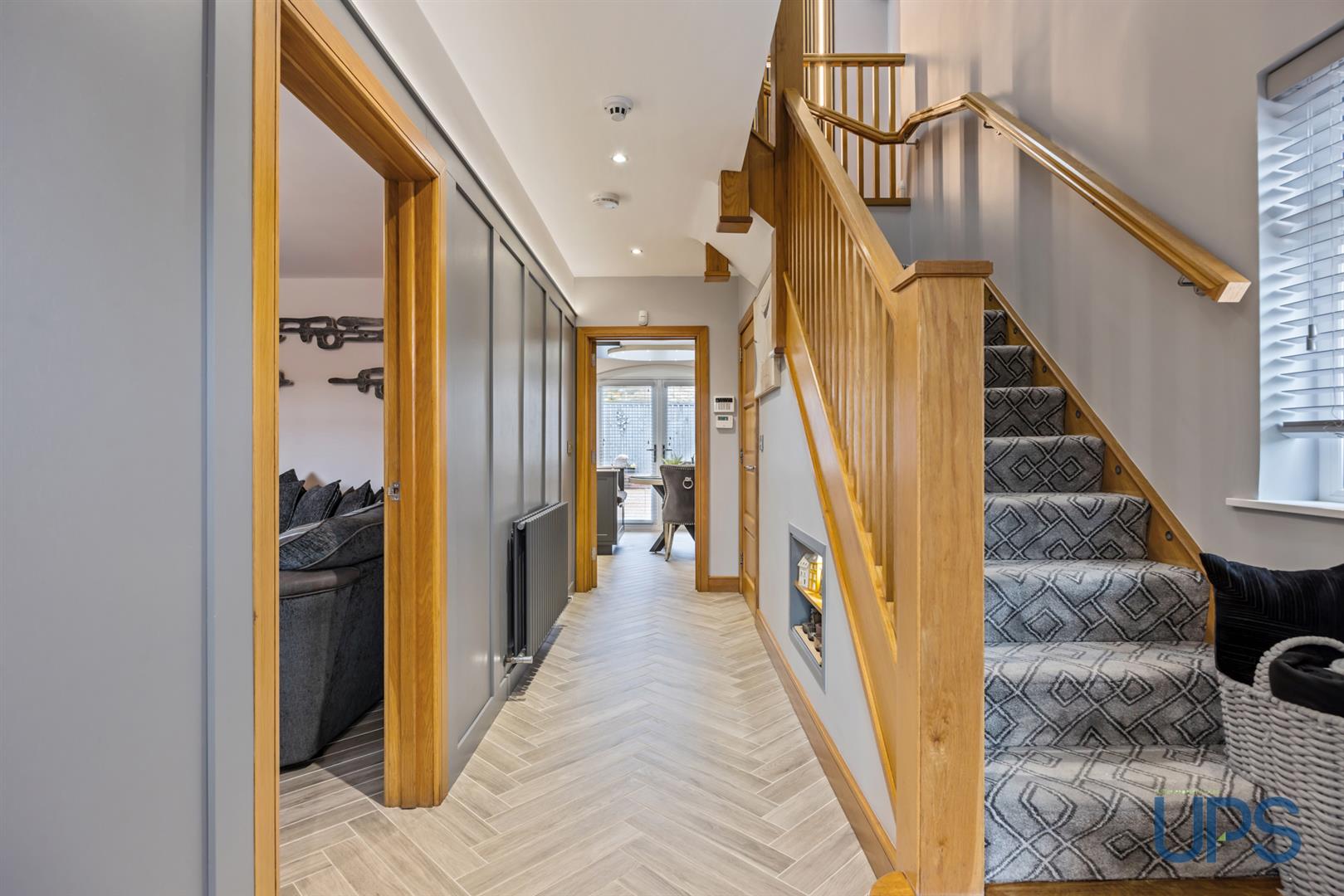 uPVC double-glazed front door opening into a spacious and welcoming entrance hall, featuring a beautiful herringbone-effect tiled floor, recessed spotlights, a charming shelf detail within the staircase, and stylish wood paneling.