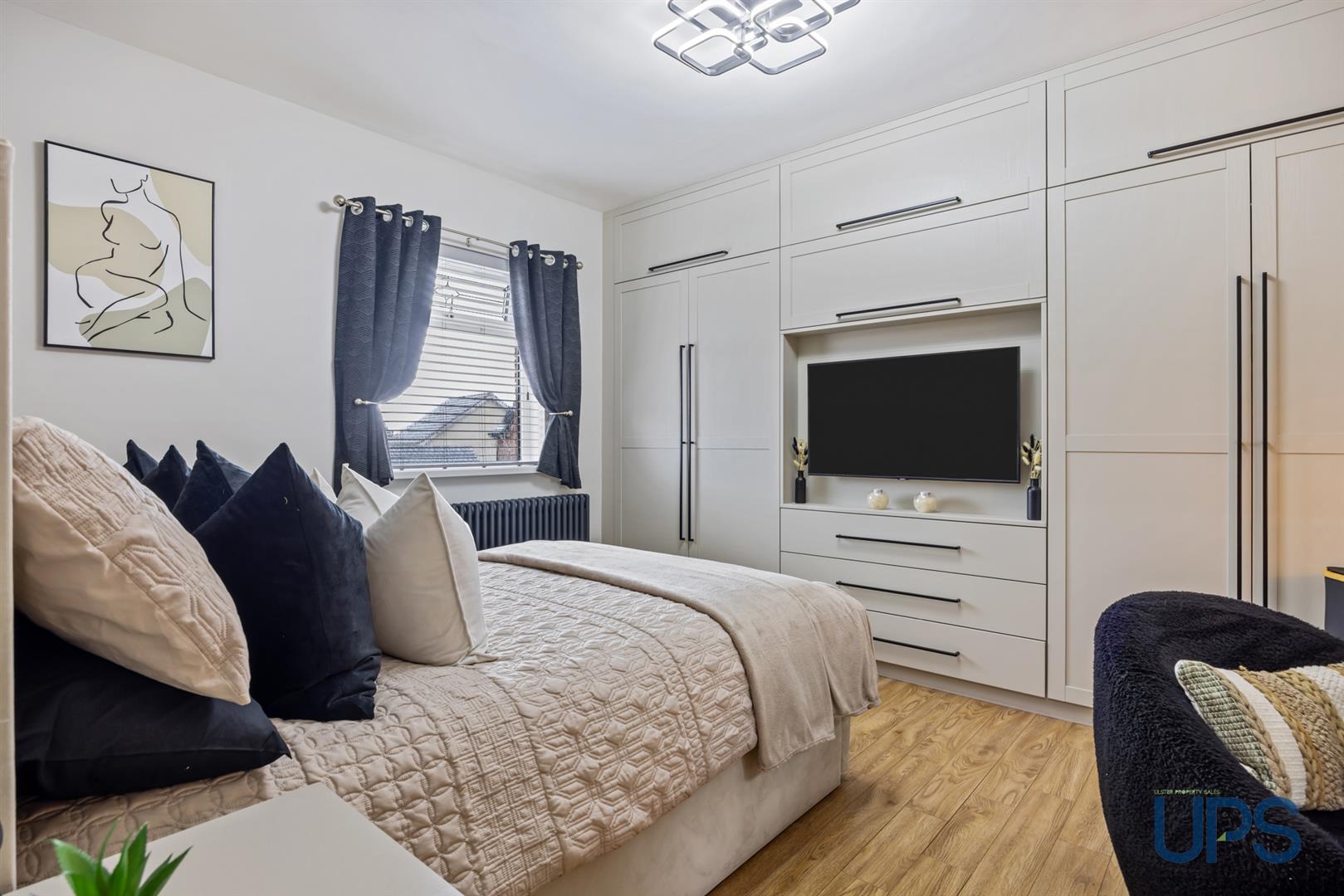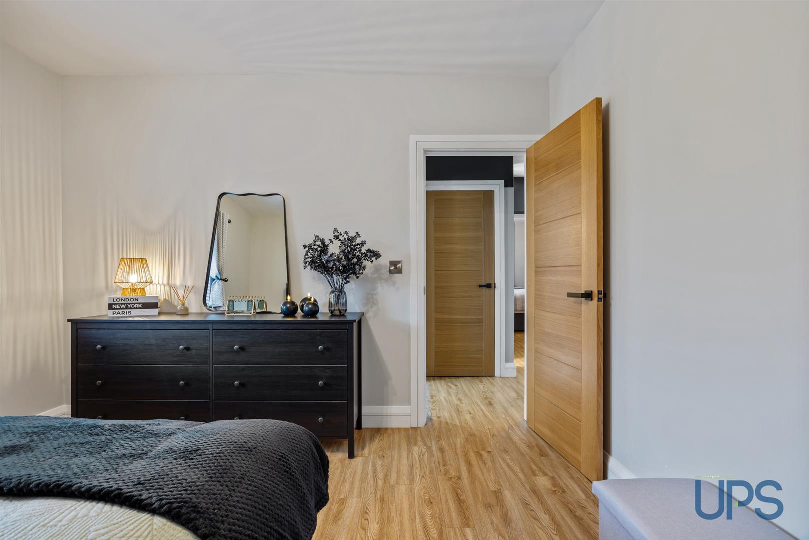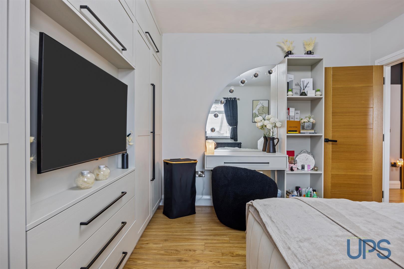 Wooden-effect stripped floor, complemented by an excellent range of modern built-in wardrobes and furniture.