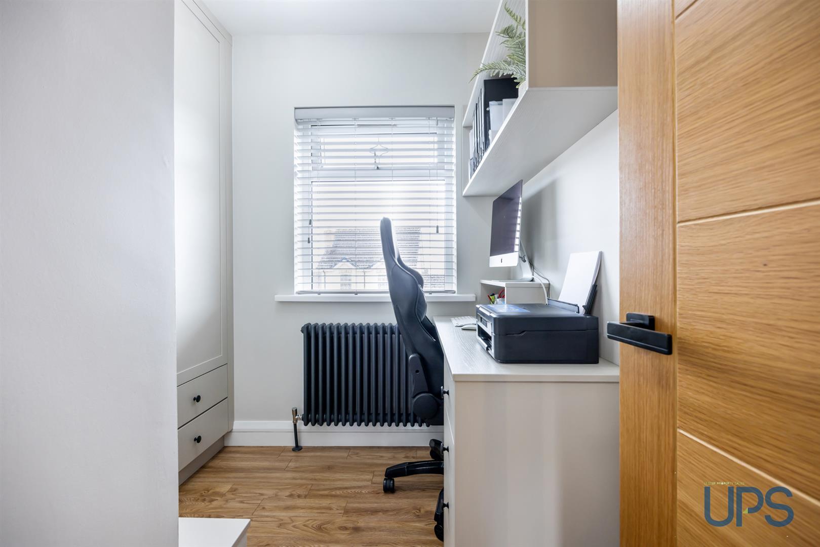 Wooden-effect stripped floor, plus a shelved storage cupboard for practical storage.