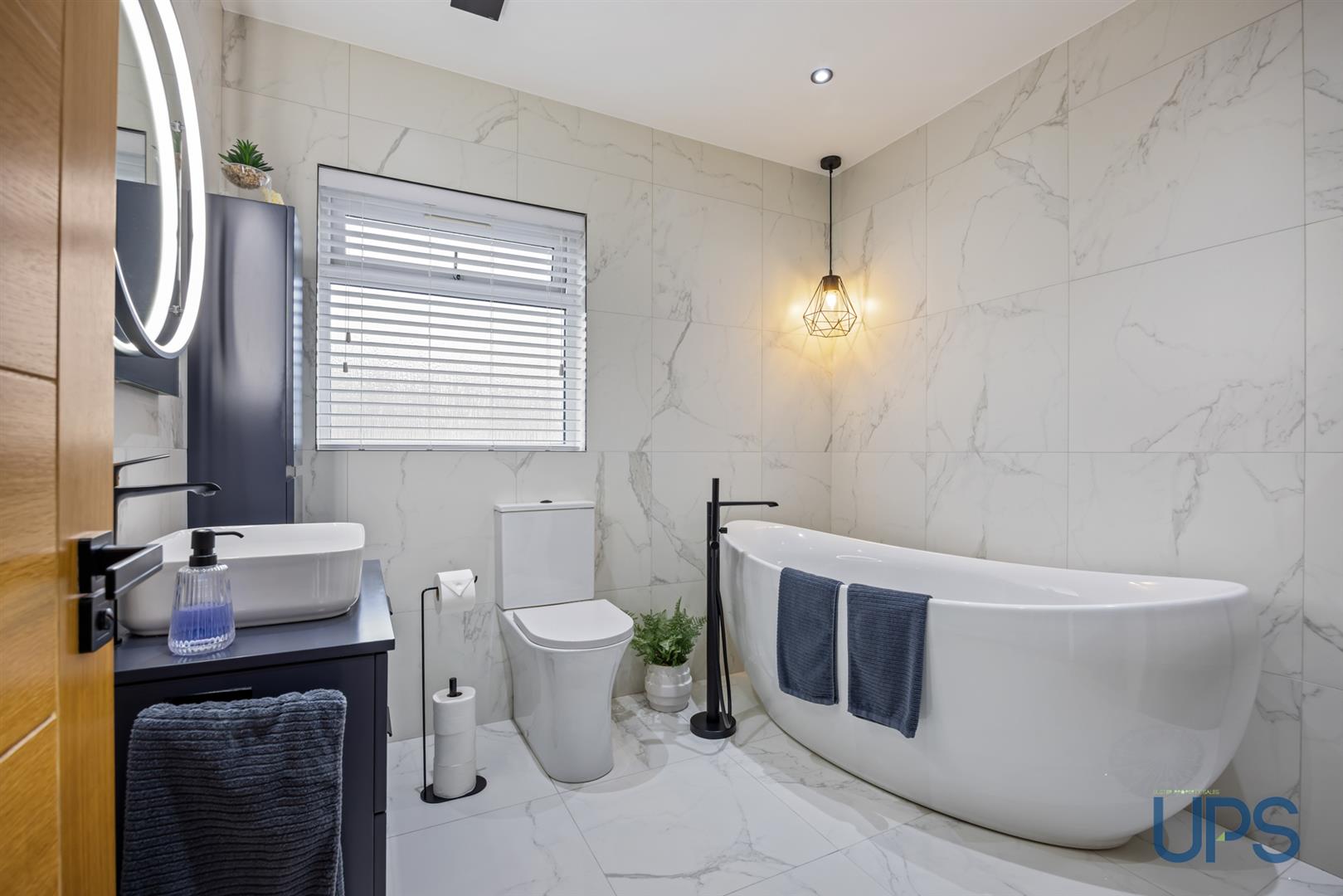 Feature contemporary bath with freestanding taps, separate shower cubicle with thermostatically controlled shower, wall-hung wash hand basin with storage, and low-flush W.C. The room is finished with spotlights and beautifully fully tiled walls and floor.