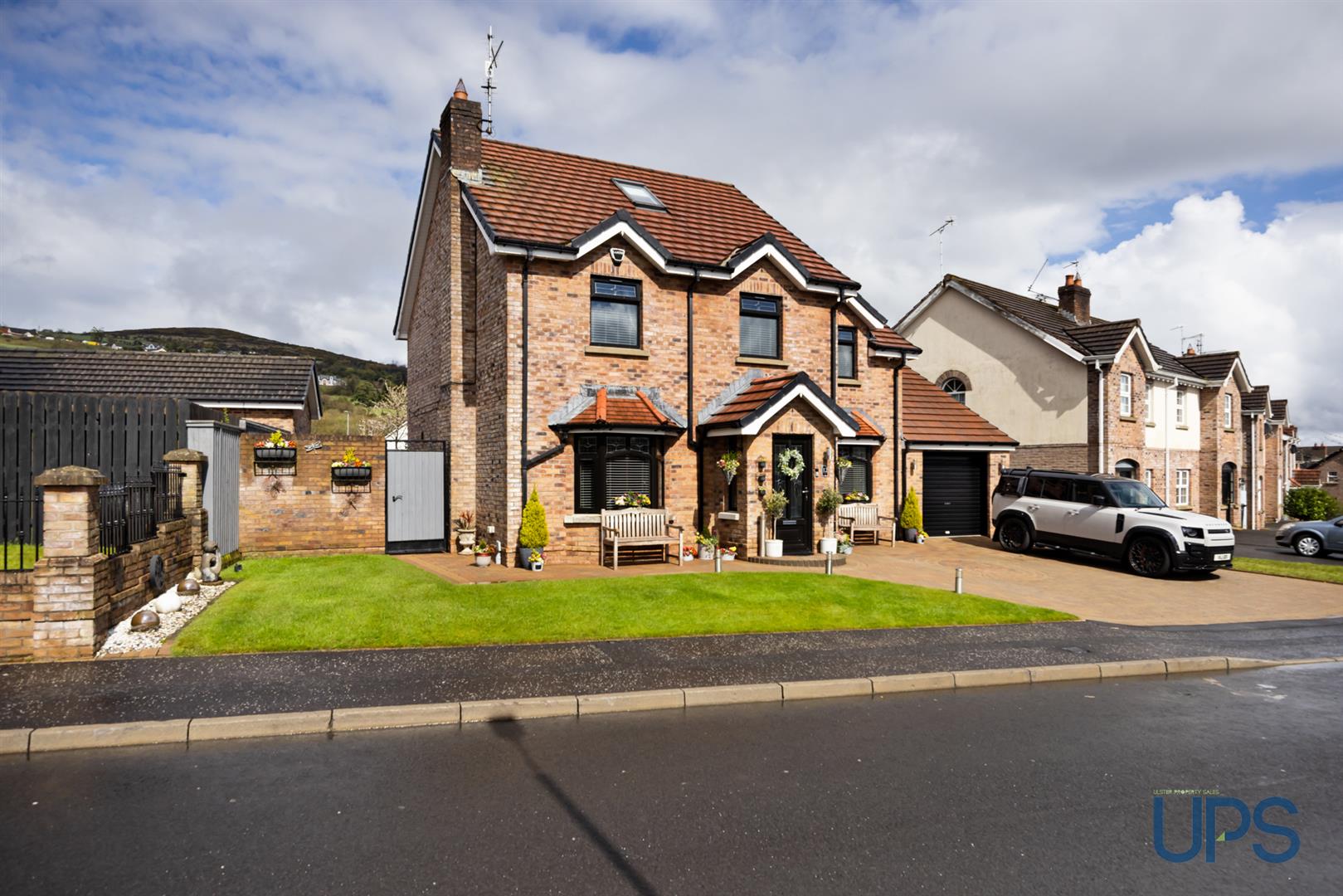 Off-road car parking for multiple vehicles to the front, with a well-maintained brick-paviour driveway and pathways, and a neatly kept front garden. To the rear, a privately enclosed, low-maintenance brick-paviour garden offers beautiful views towards Black Mountain, an outdoor tap, and a useful side area.
