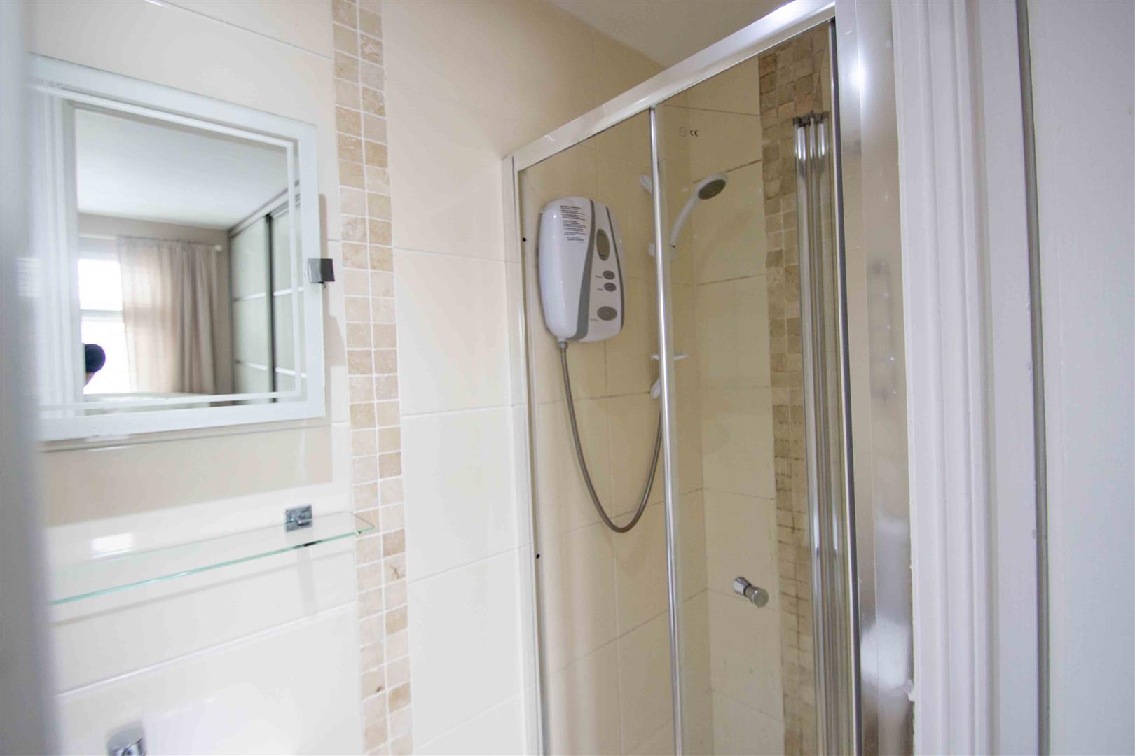 Shower cubicle, electric shower unit, low flush w.c, pedestal wash hand basin, chrome effect sanitary ware, tiled walls and floor, spotlights, extractor fan.