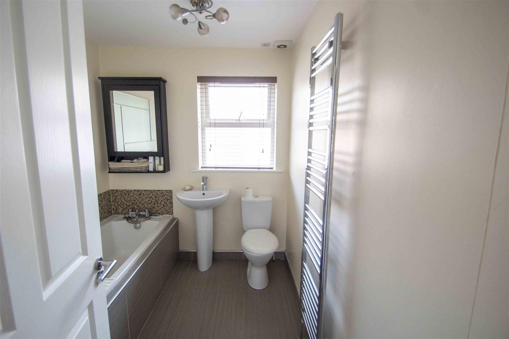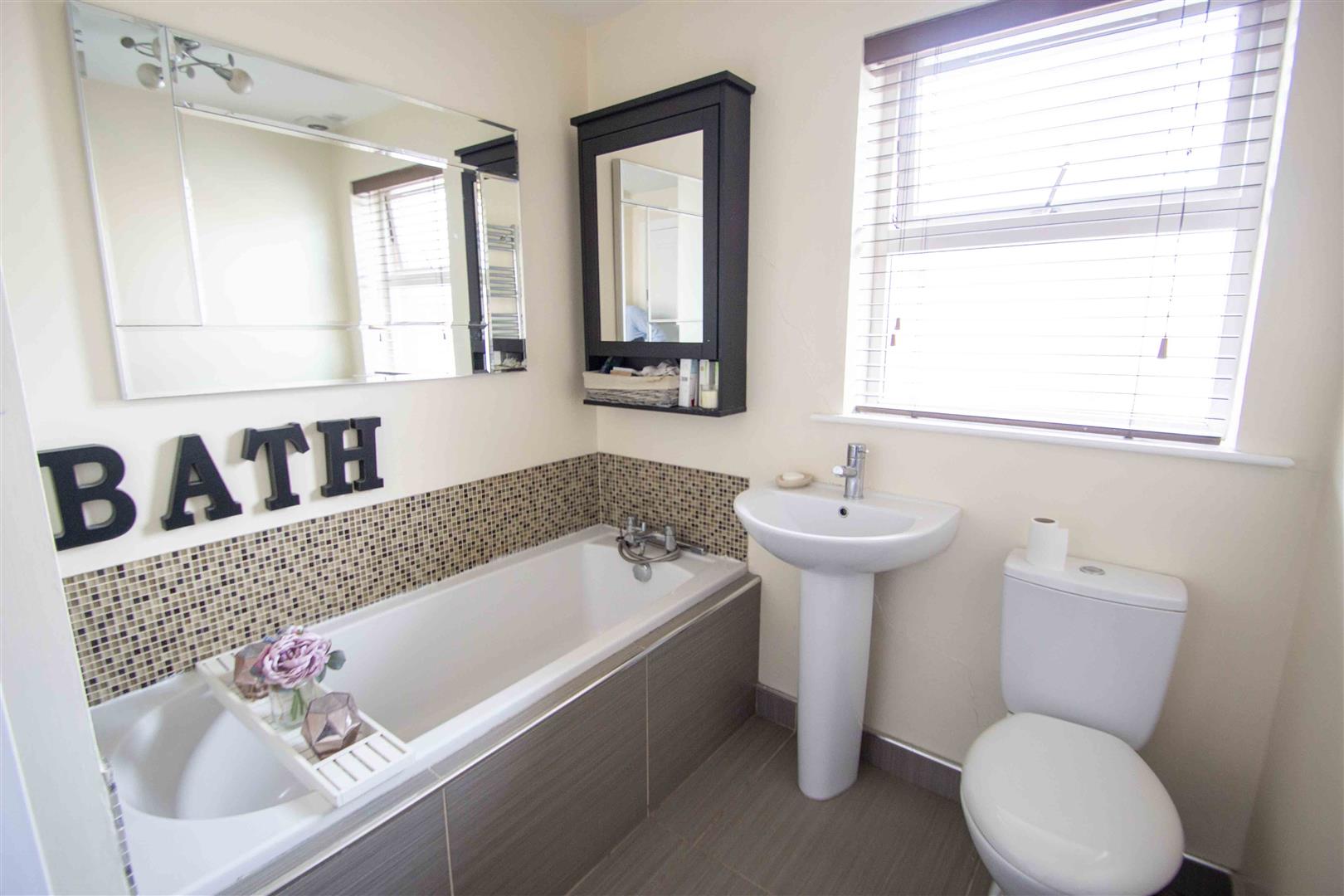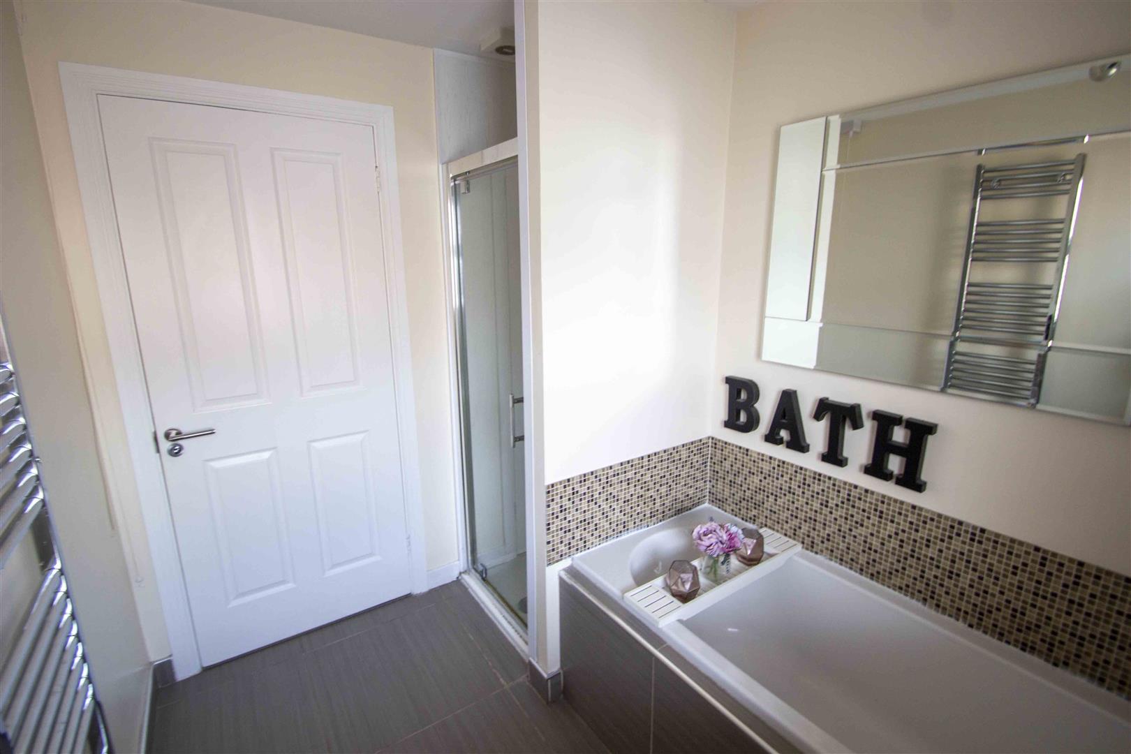 Bath with mixertaps, telephone hand shower, separate shower cubicle, electric shower unit, low flush w.c, pedestal wash hand basin, chrome effect sanitary ware, chrome towel warmer.