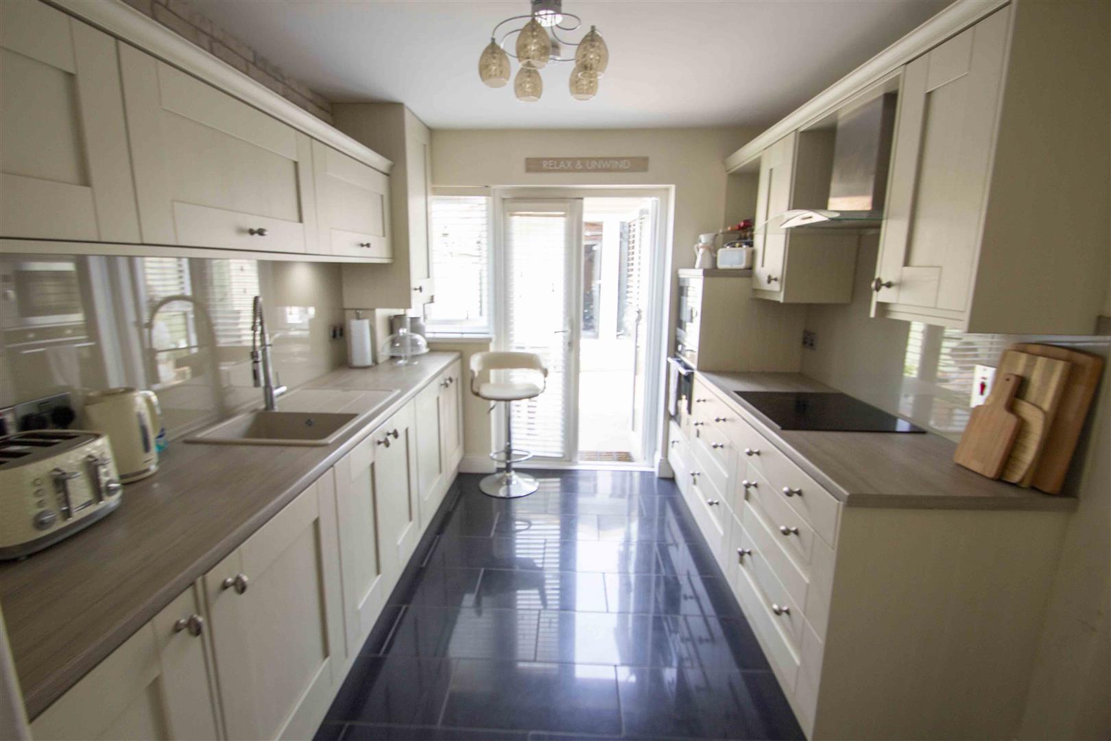 Range of high and low level units, single drainer sink unit, built-in 4 ring hob, stainless steel extractor fan, feature splash back, under unit lighting, built-in microwave, built-in oven, integrated fridge and freezer, beautiful tiled floor, feature Upvc double glazed double doors to gardens.