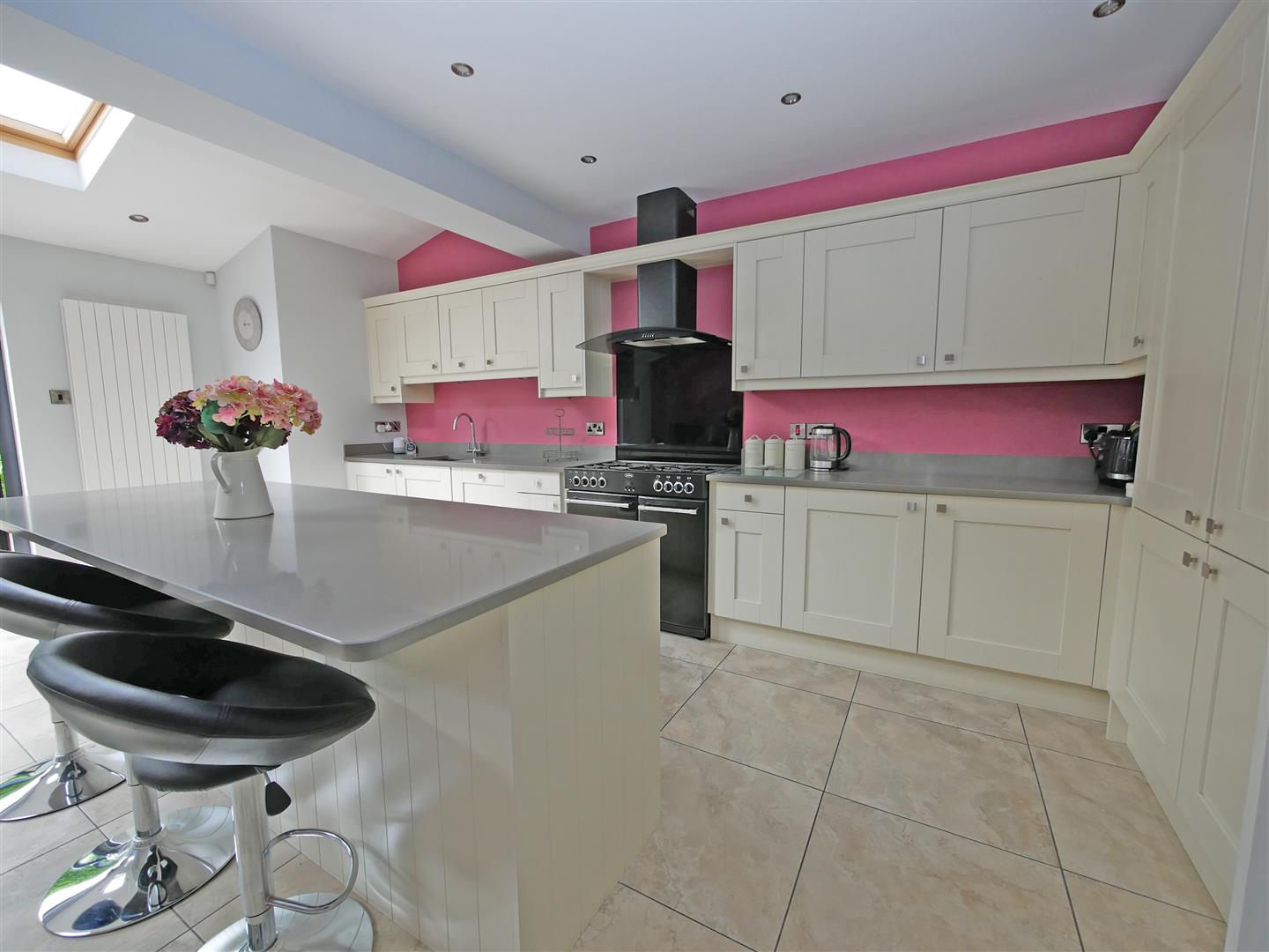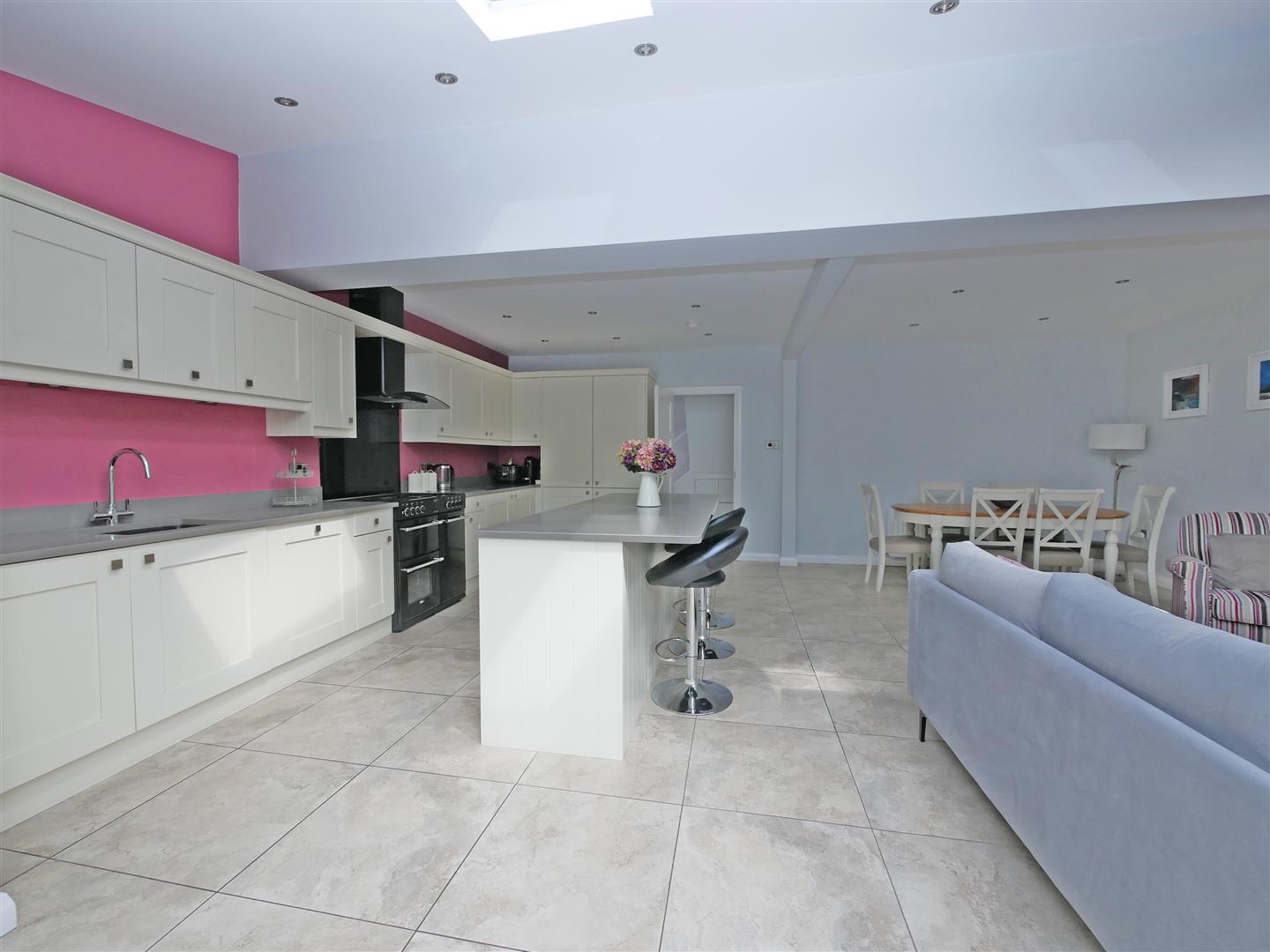 Extended open plan kitchen / living / dining room complete with multi-fuel stove and triple glazed bi-folding doors which open onto private patio area. Tiled flooring with spotlights and velux windows.