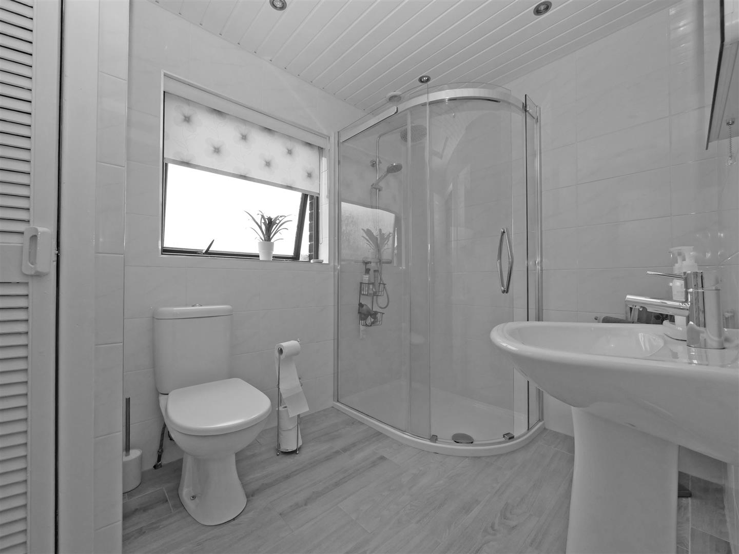 Modern fitted shower suite complete with low flush w.c, pedestal wash hand basin, walk in shower with thermostatically controlled shower, heated chrome towel rail and built-in storage cupboard. Fully tiled walls and spotlights.