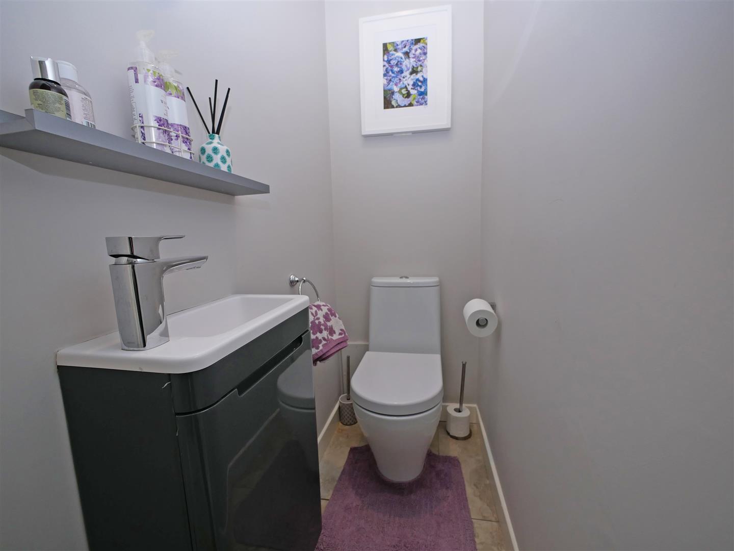Ground floor w.c with low flush w.c and wash hand basin with vanity. Tiled flooring.