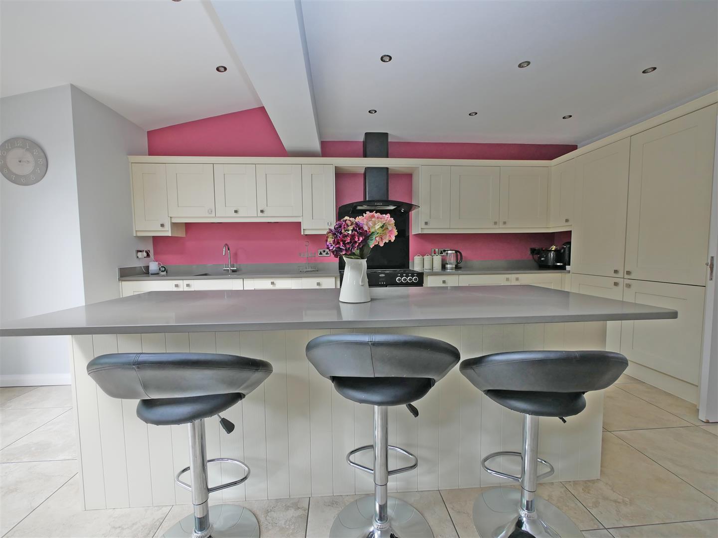 Modern fitted shaker style kitchen complete with a selection of upper and lower level units with marble worktops, central island with breakfast bar and additional storage units, integrated fridge freezer, dishwasher, microwave and sink unit with stainless steel mixer taps. Kitchen also benefits from having a 5 ring gas hob along with a 'bellingham' electric oven and over head extractor fan.
