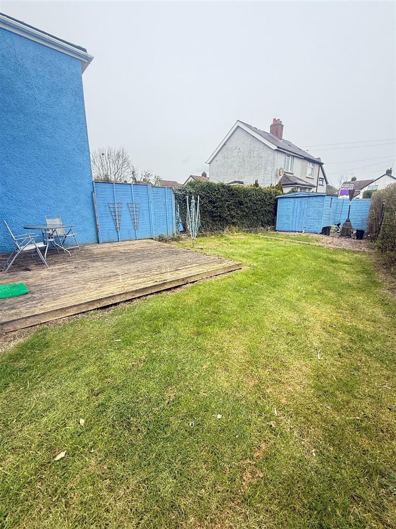 Side and rear in lawn and timber decking, garden shed, mature hedging, outside light and tap.