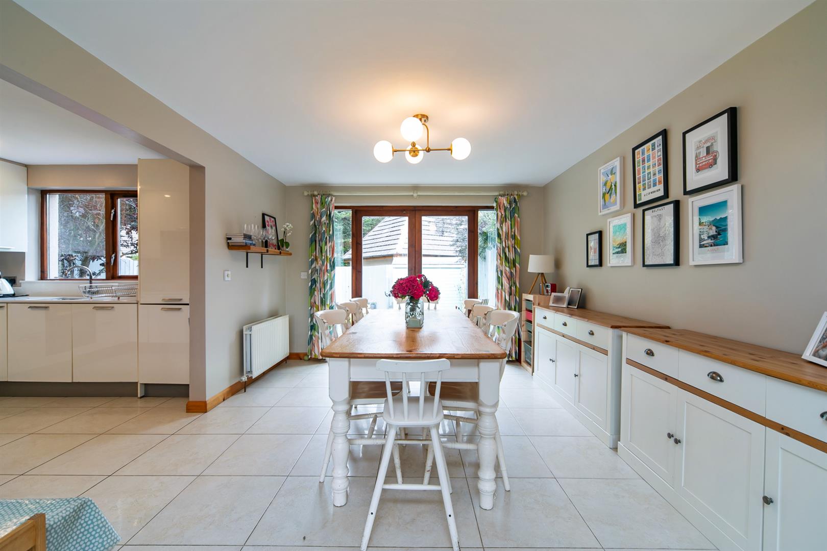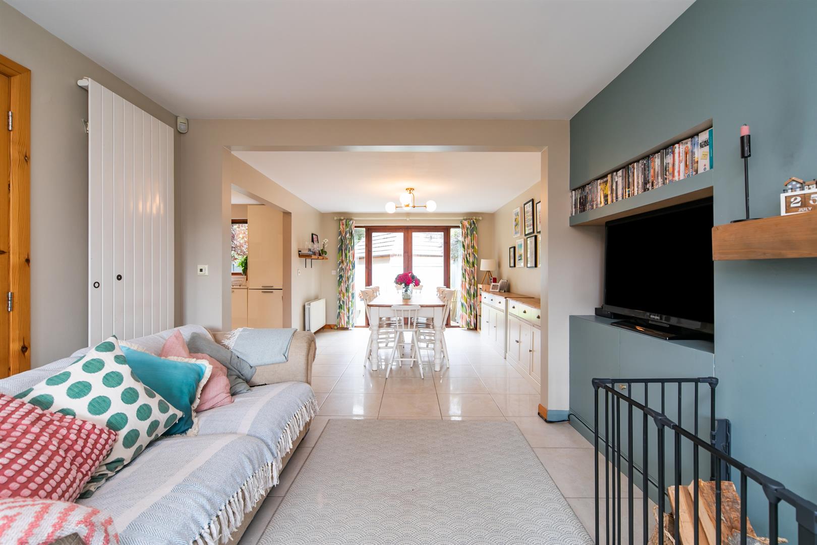 Porcelain tiled floor, patio door to garden, open to:-