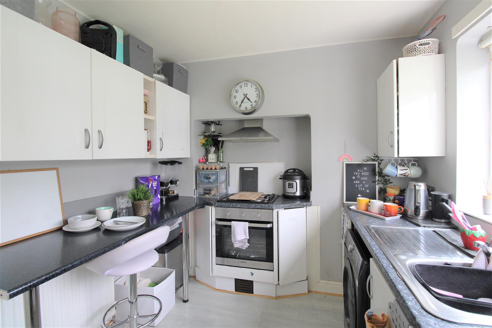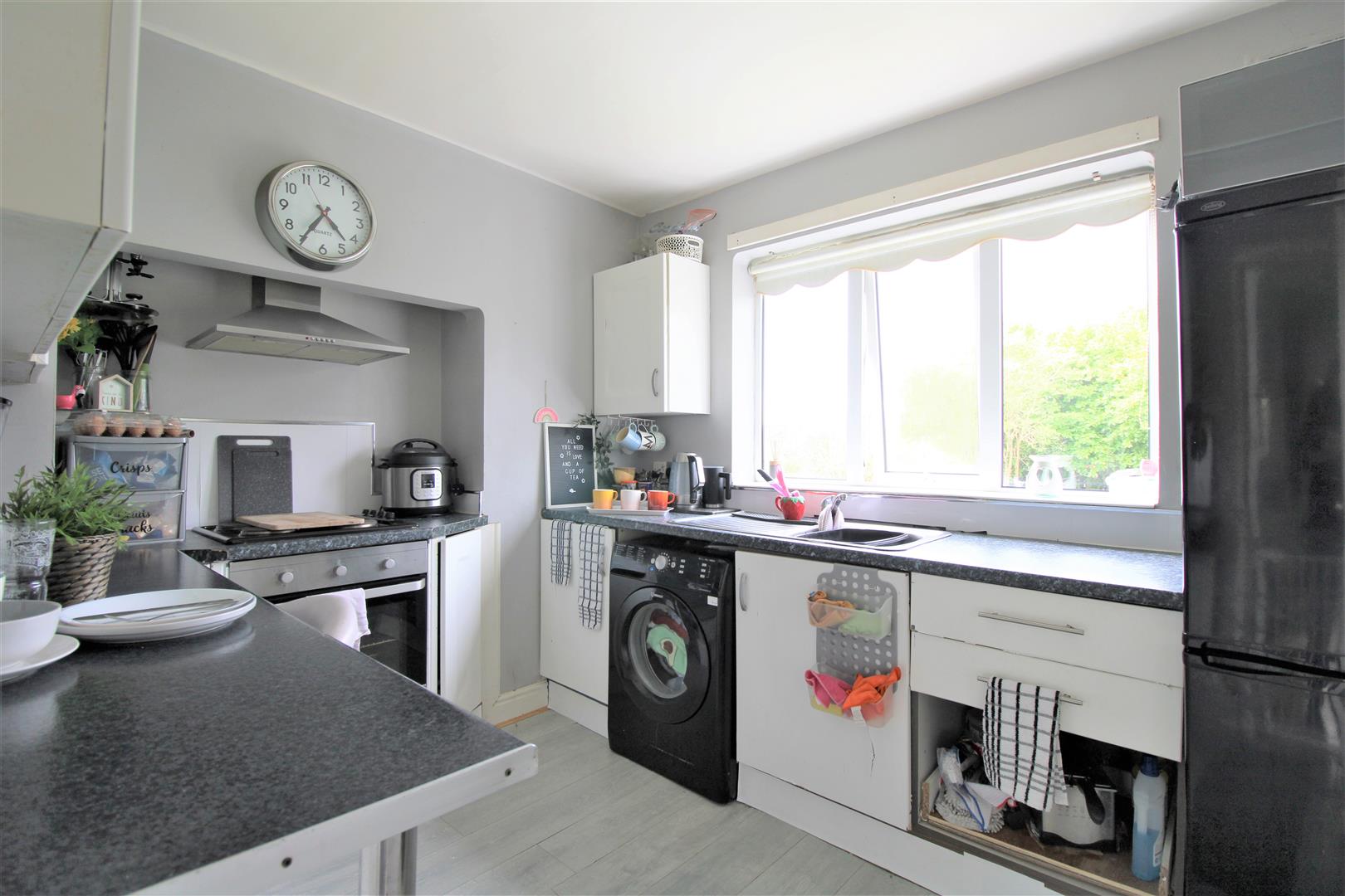Single drainer stainless steel sink unit, range of high and low level units, formica worktops, built-under oven and hob, plumbed for washing machine, under fridge space, double panelled radiator, uPvc double glazed rear door.