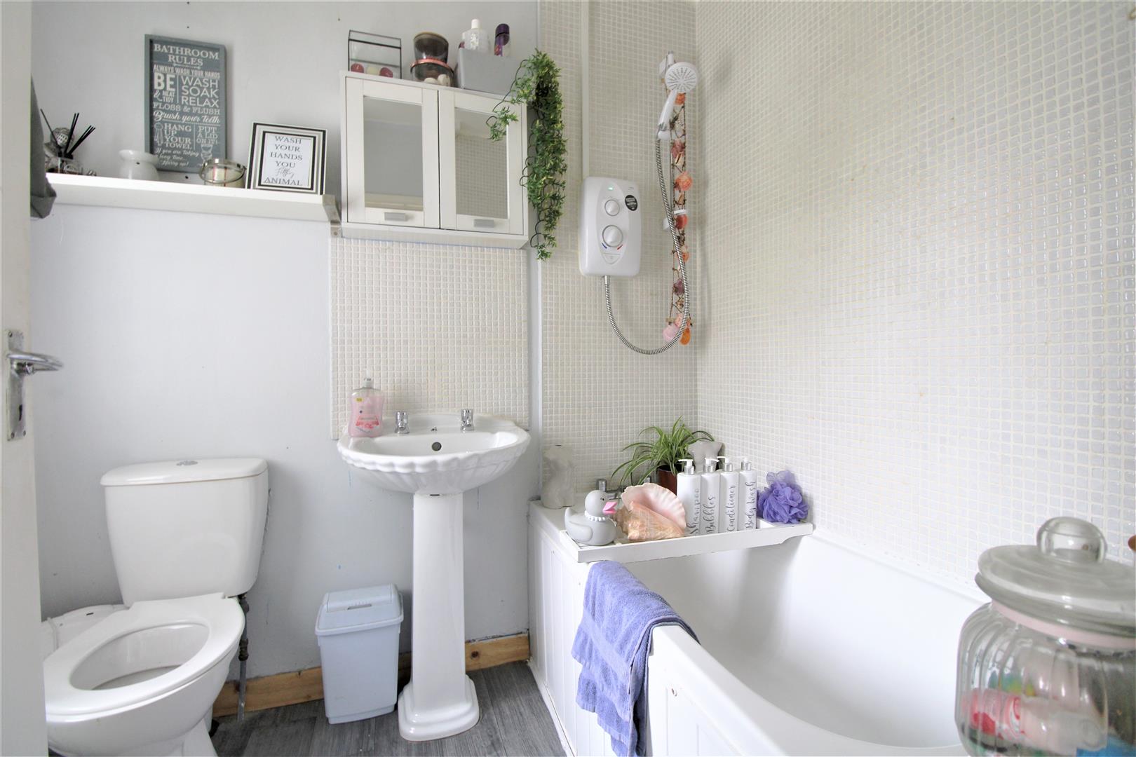 Classic white suite with chrome fitments comprising panelled bath, electric shower, pedestal wash hand basin, low flush wc, partly tiled walls, double panelled radiator.
