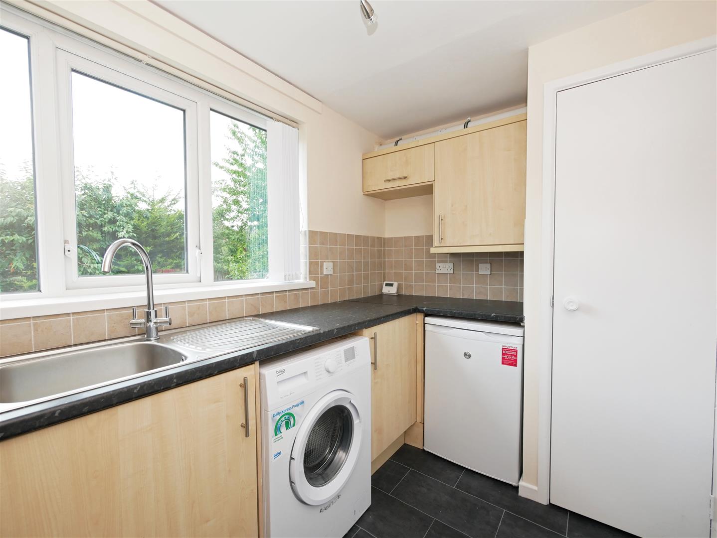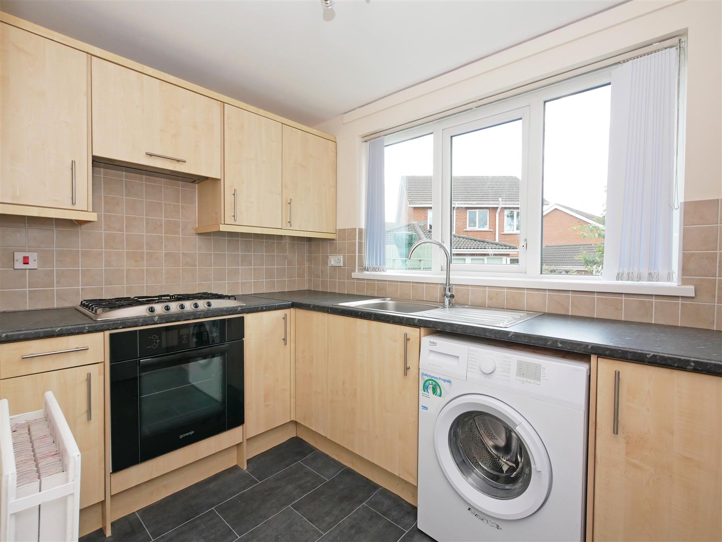 Fitted kitchen with a selection of upper and lower level units with formica worktops, stainless steel sink and drainer and electric oven with stainless steel gas hob. Plumbed for washing machine. Storage cupboard housing gas boiler. Part tiled walls and vinyl flooring