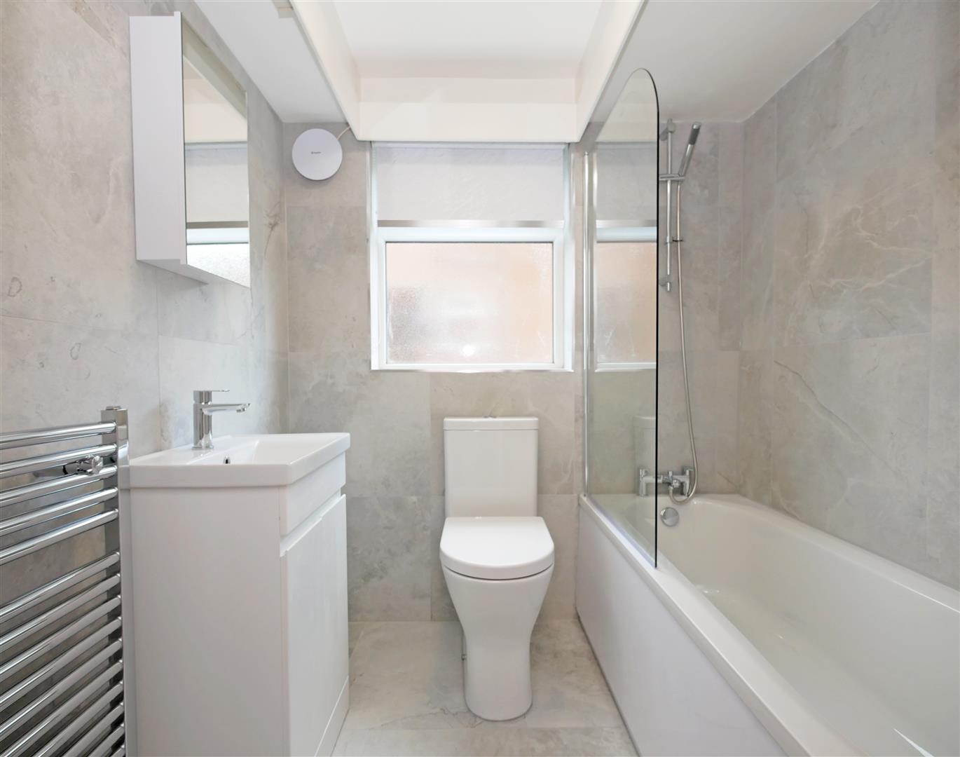 Newly fitted white bathroom suite comprising of pannelled bath with over hanging shower attachment, wash hand basin with stainless steel mixer taps and low flush w.c. Grey tiled flooring and walls