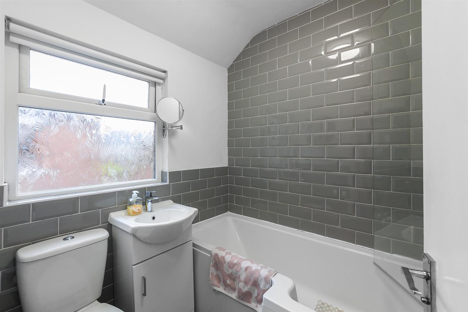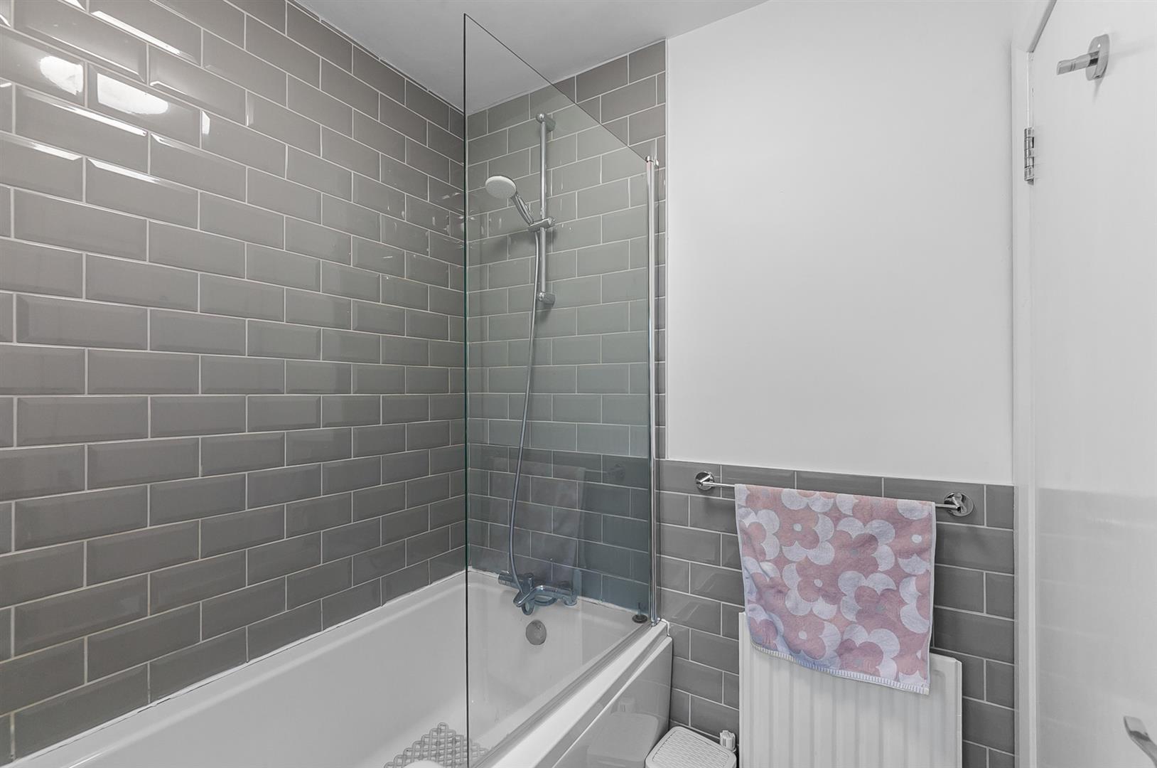 Panelled bath, wash hand basin, low flush w.c, tiling, telephone hand shower, shower screen.