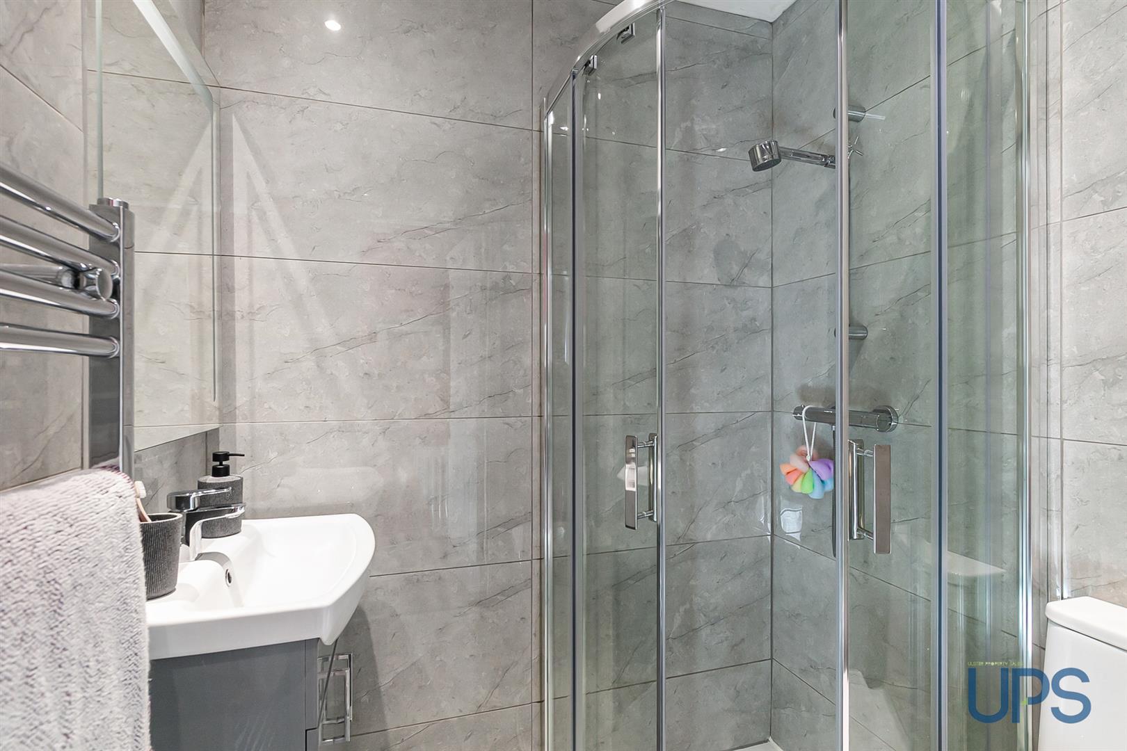 Shower cubicle, thermostatically controlled shower unit, low flush w.c, wash hand basin and storage unit, chrome effect sanitary ware, chrome effect towel warmer, spotlights, extractor fan, beautiful tiled walls and floor.