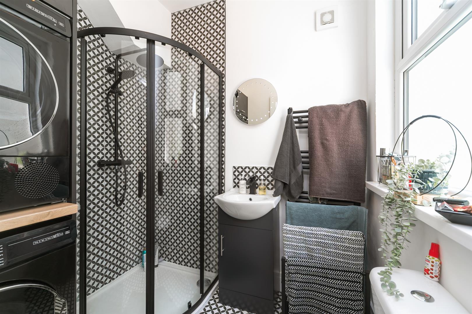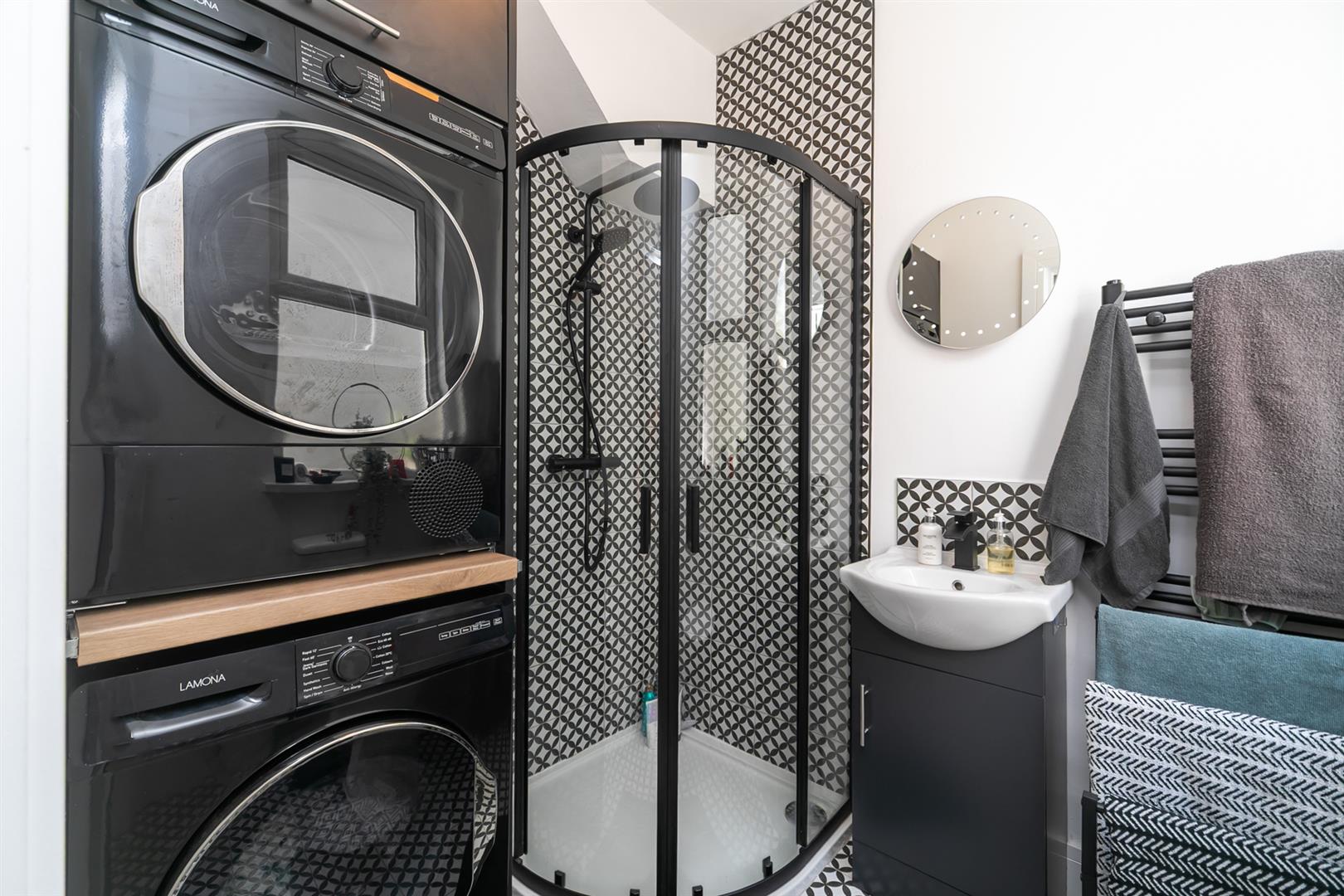 New white suite comprising walk-in shower cubicle with built-in rainfall and handheld shower, tiled walls and sliding shower doors, vanity unit with mixer tap, tiled splashback, low flush WC, utility unit with plumbing for washing machine and space for dryer. Tiled floor, wall mounted radiator, extractor fan.