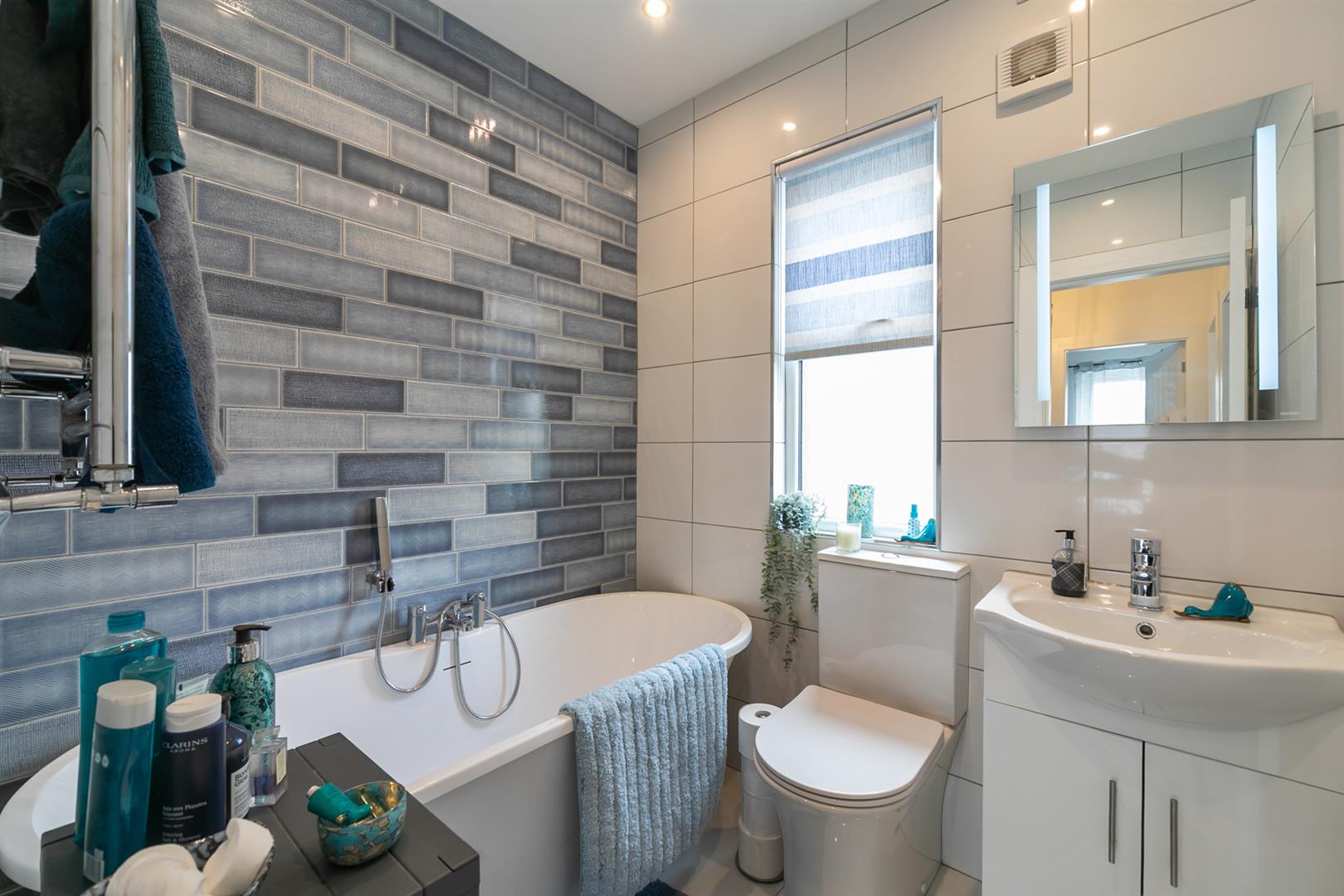New white suite comprising freestanding bath with mixer tap and handheld shower, vanity unit with mixer tap and sensor touch mirror, low flush WC, fully tiled walls and ceramic tiled flooring. Wall mounted chrome feature radiator, recessed spotlighting, extractor fan.