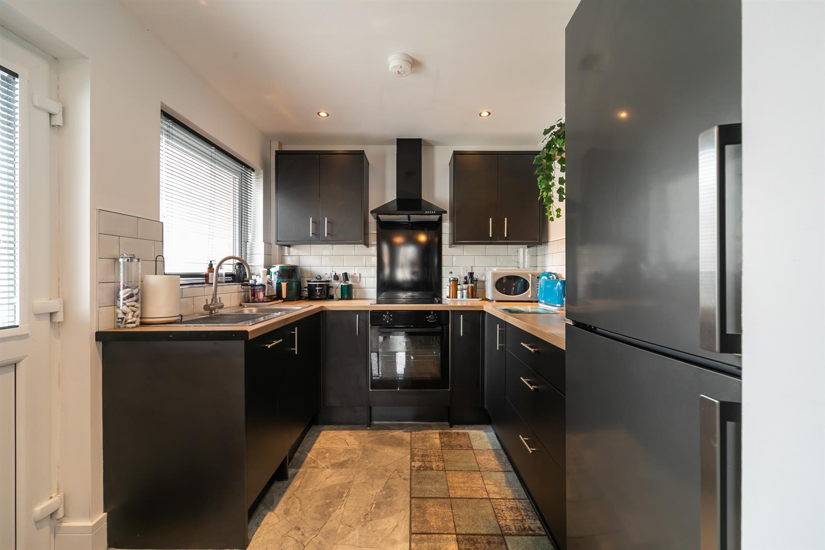 New range of high and low level units, wood effect laminate work surfaces, inset single drainer stainless steel sink unit with mixer tap, built-in under oven, ceramic hob, aluminium splashback and extractor hood, integrated slimline dishwasher, space for fridge freezer, part tiled walls, porcelain tiled flooring, recessed spotlighting.