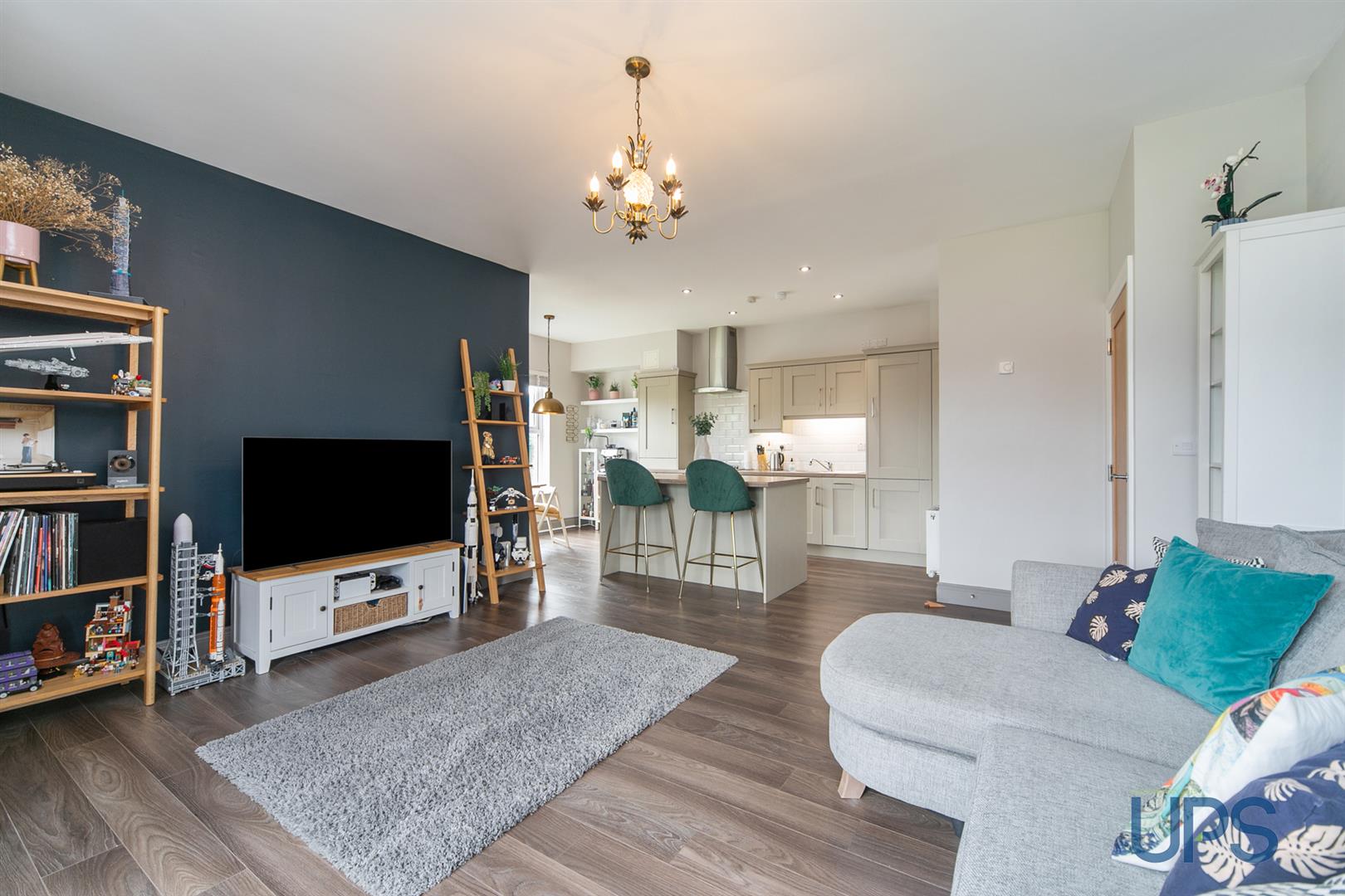 An eye-catching and most impressive living area with a bay window and open plan to a luxury fitted kitchen with an entertaining area (kitchen with a range of integrated appliances)