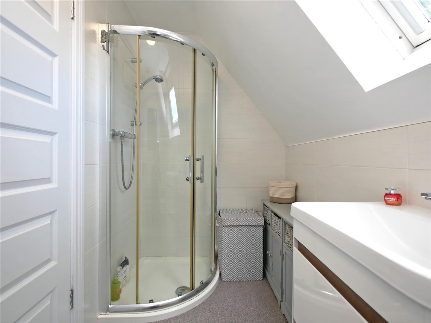 White shower suite comprising of corner shower cubicle, sink basin with vanity and low flush w.c. Part tiled walls and tiled flooring.