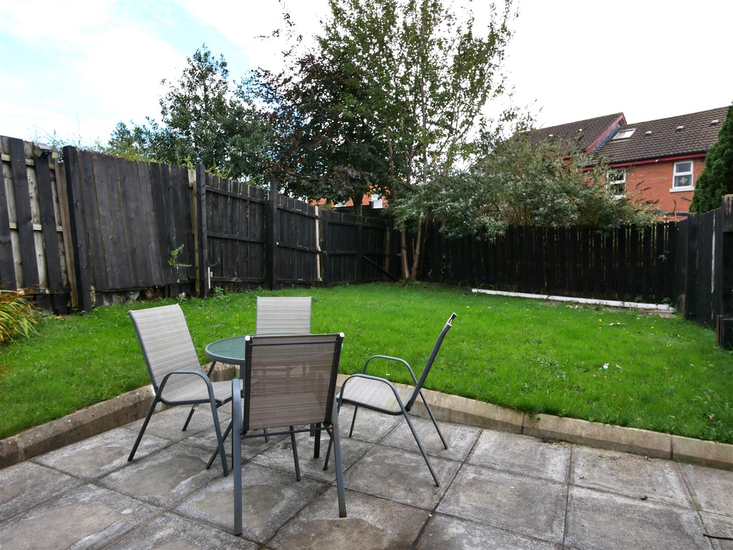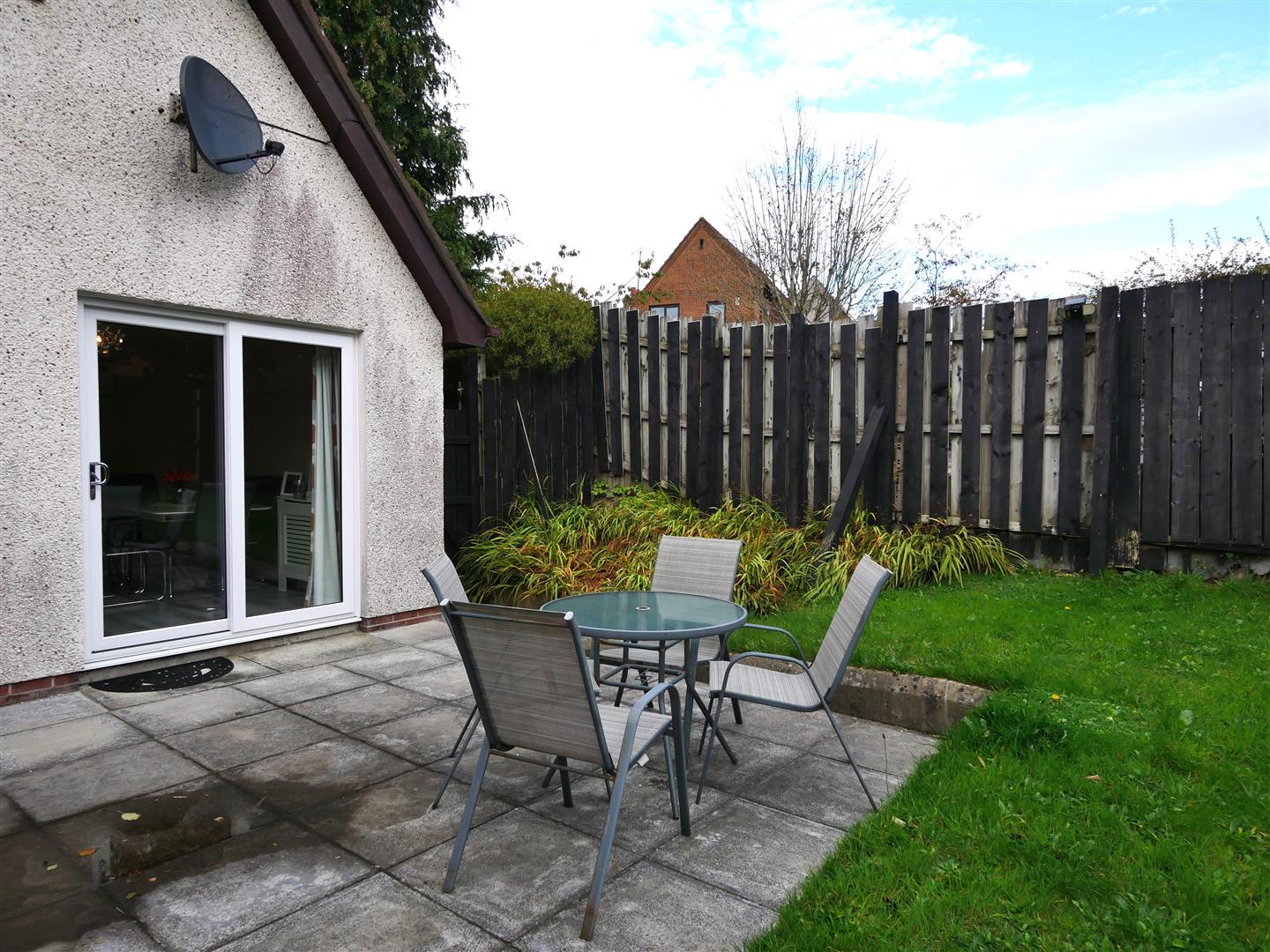 Enclosed rear garden with patio area and laid lawns bordered by timber fencing.