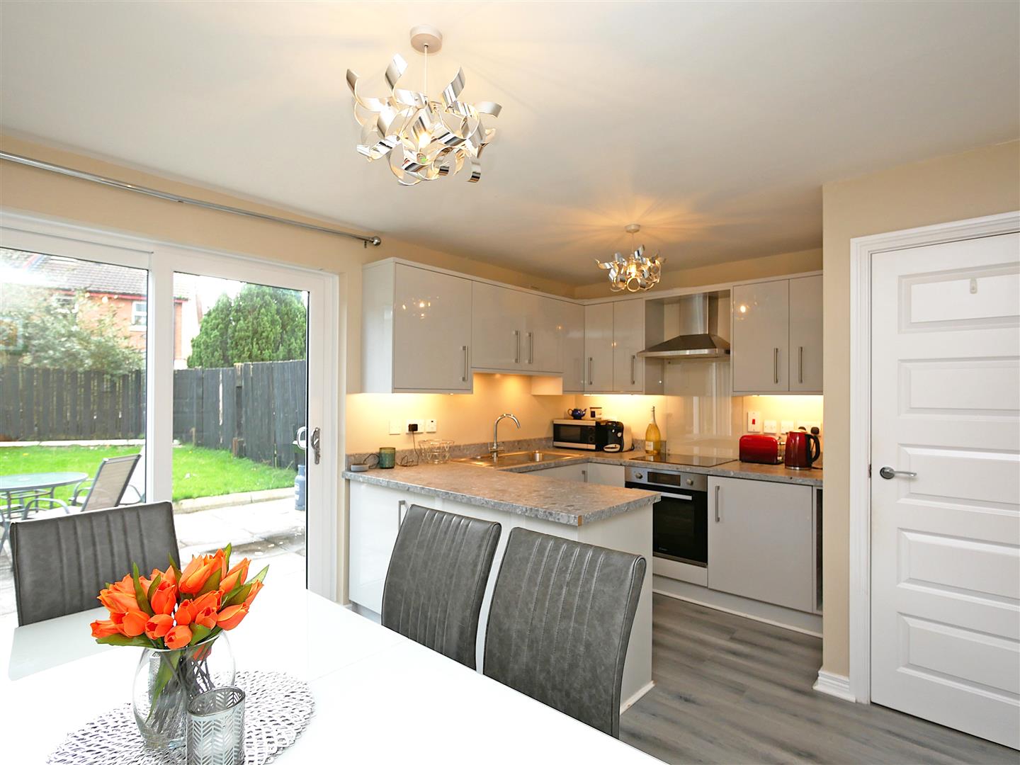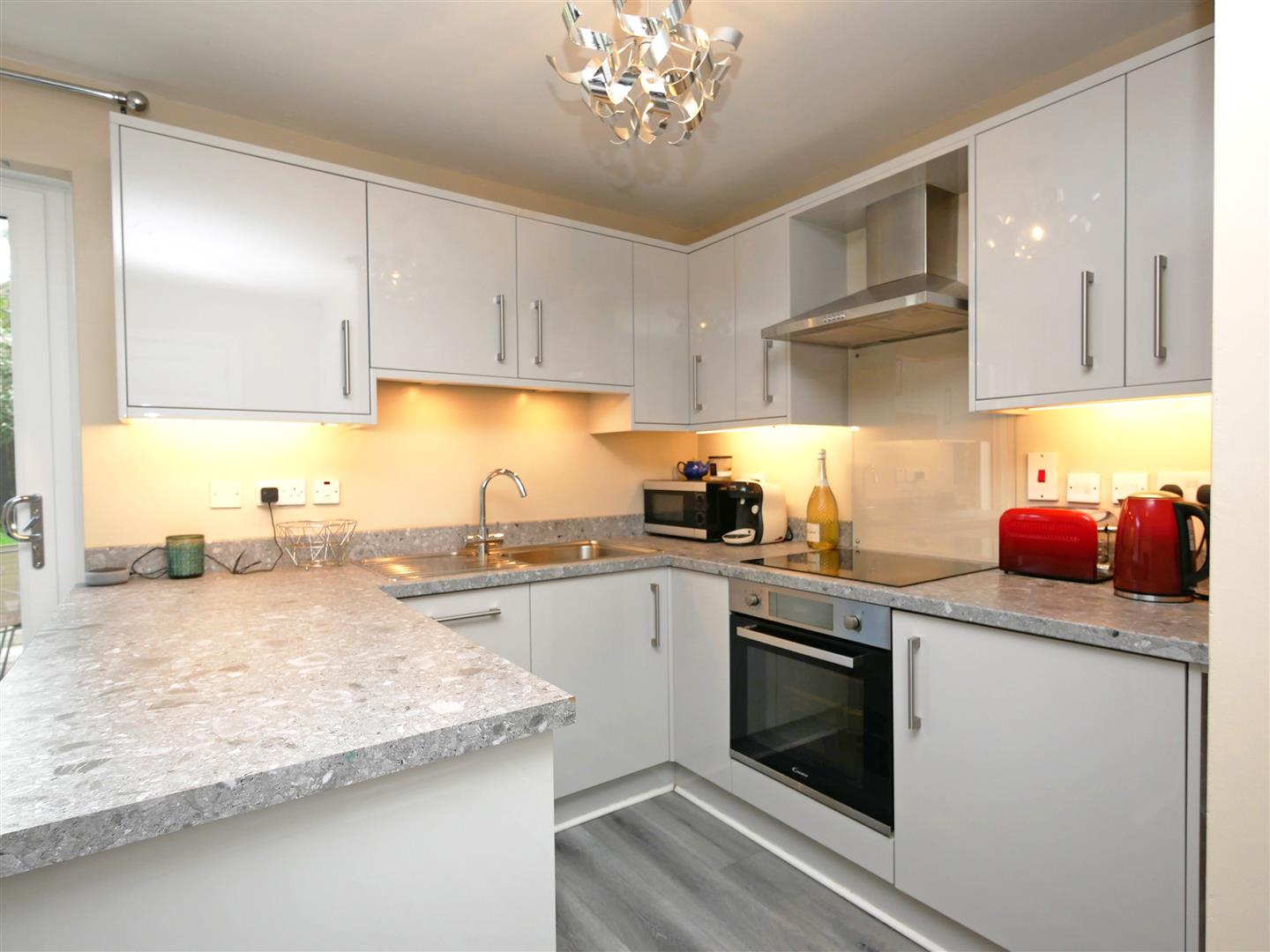 (measurements at widest points) Modern fitted kitchen with a selection of upper and lower level units complete with integrated electric oven and hobs, stainless steel sink with drainer and undercounter fridge freezer. Storage cupboard plumbed for washing machine. Laminate flooring. Glazed upvc patio doors opens onto enclose rear garden.