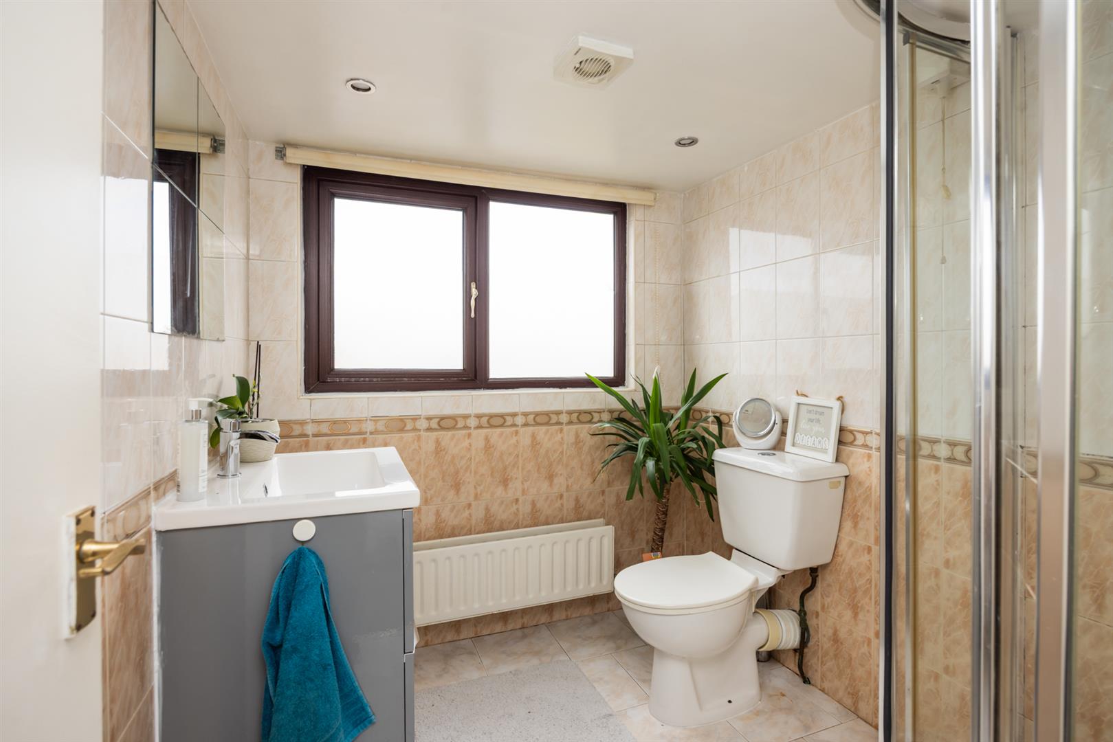 White suite comprising: walk in shower cubicle with electric shower and sliding shower door, vanity unit with mixer taps, low flush WC, fully tiled walls, ceramic tiled flooring, recessed spotlighting, extractor fan.