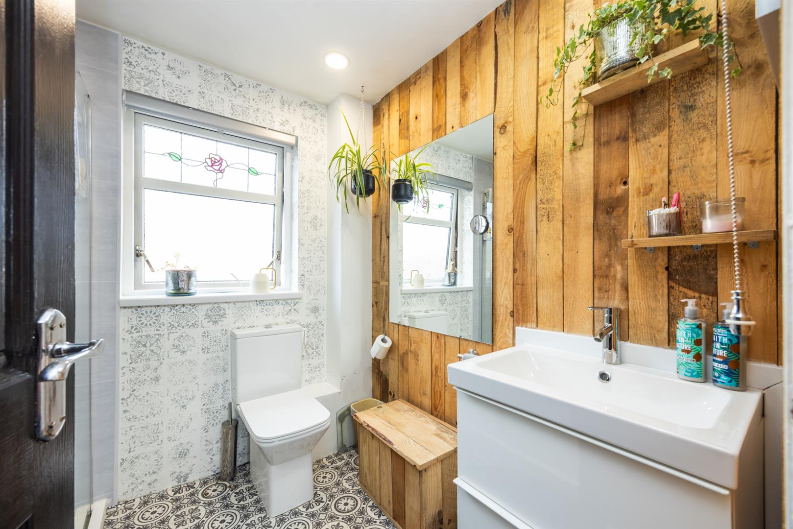 Modern white suite comprising: Large walk in shower cubicle with built in rainfall shower and hand held shower, PVC wall cladding, shower screen, vanity unit with mixer taps, low flush WC, chrome feature wall mounted radiator, part wood panelled walls, recessed spotlighting.