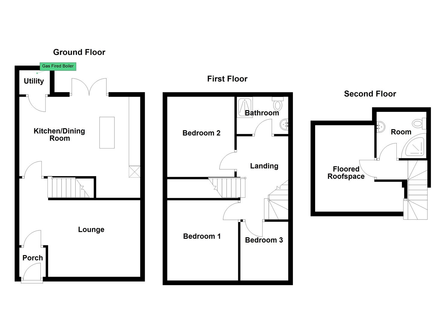 Gas fired boiler, plumbed for washing machine, ceramic tiled flooring.