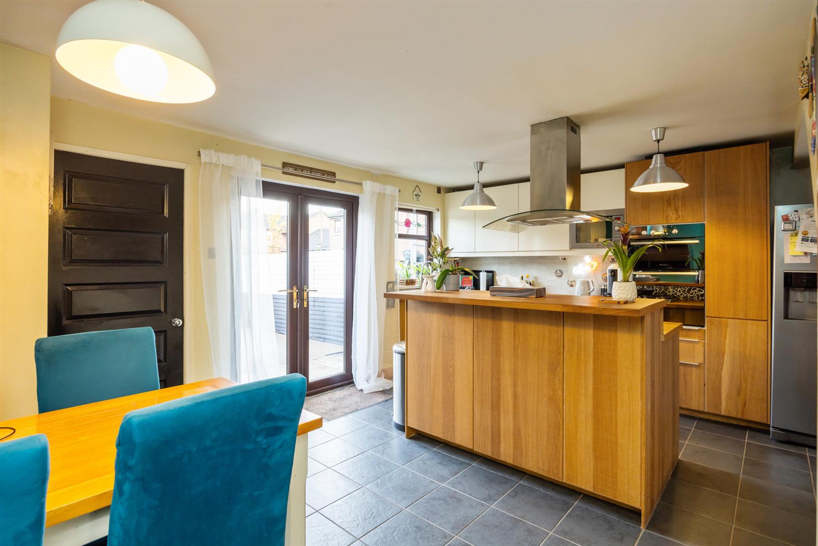 Attractive range of high and low level units with wood block work surfaces, inset single drainer stainless steel sink unit with mixer taps and hose, built in double oven, integrated dishwasher, space for fridge/freezer, feature shelving, PVC panelled splashback, built in microwave, large feature island with 5 ring gas hob with stainless stell extractor hood and raised breakfast bar, ceramic tiled flooring, patio doors to gardens.