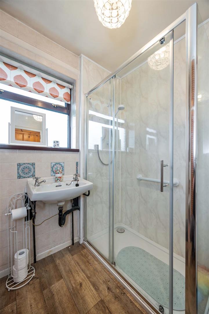 Shower cubicle, electric shower unit, low-flush W.C., wash hand basin.