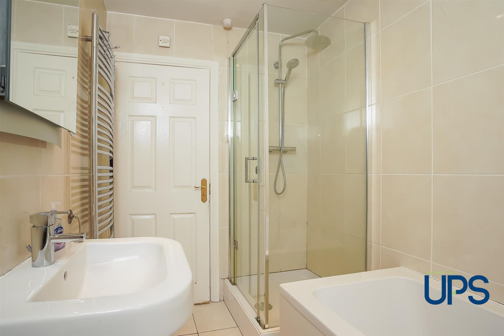 White bathroom suite with separate shower cubicle and spotlights on the first floor.
