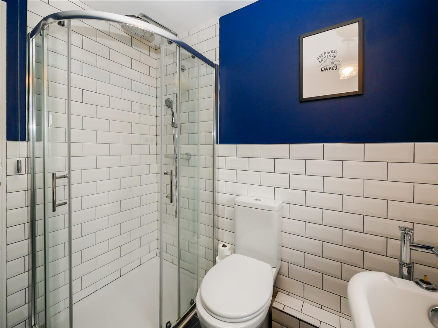 Luxury white suite comprising claw foot bath with mixer taps, corner shower cubicle with thermostatically controlled shower, wash hand basin with storage below. Part tiled walls, tiled floor, extractor fan, chrome towel radiator.