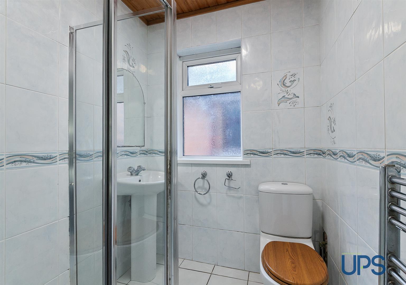 Shower cubicle, electric shower unit, low flush w.c, pedestal wash hand basin.