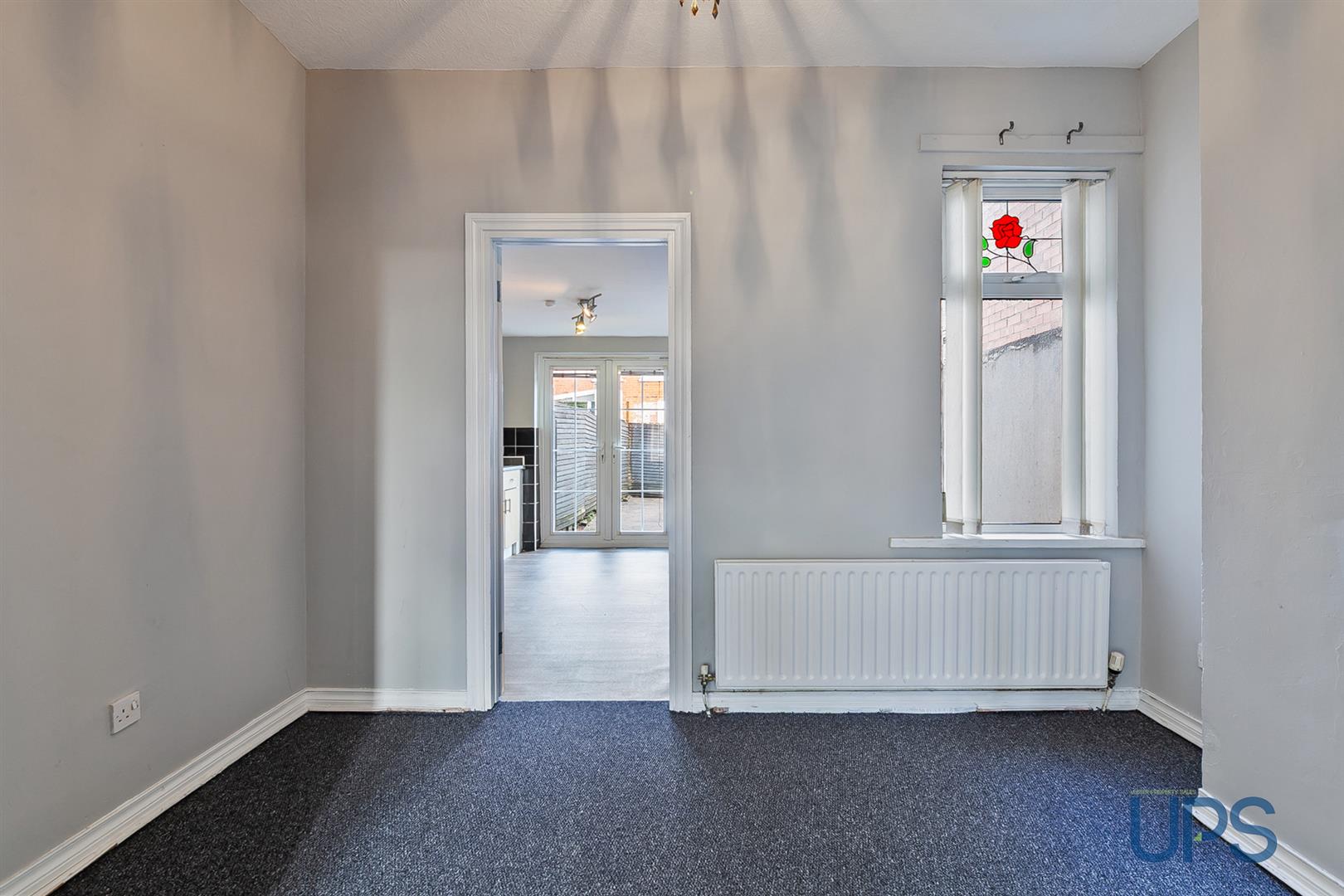 Spacious entrance hall; bright living room with bay window, open to dining area.
