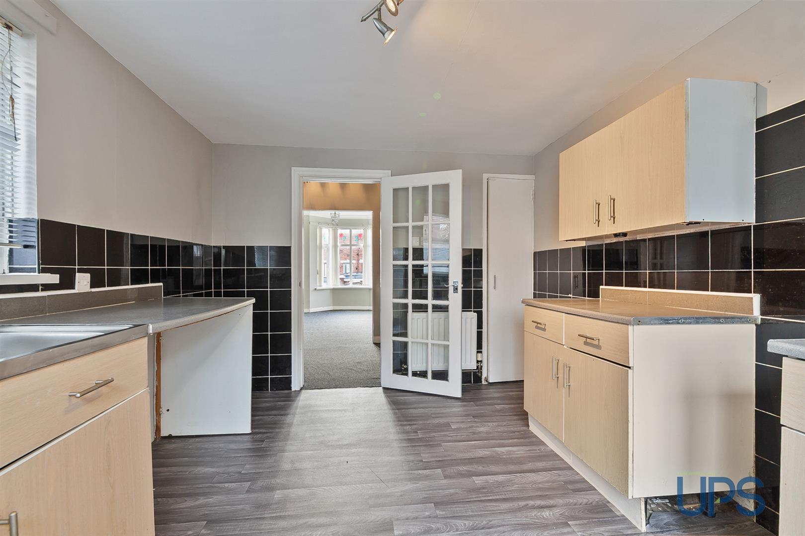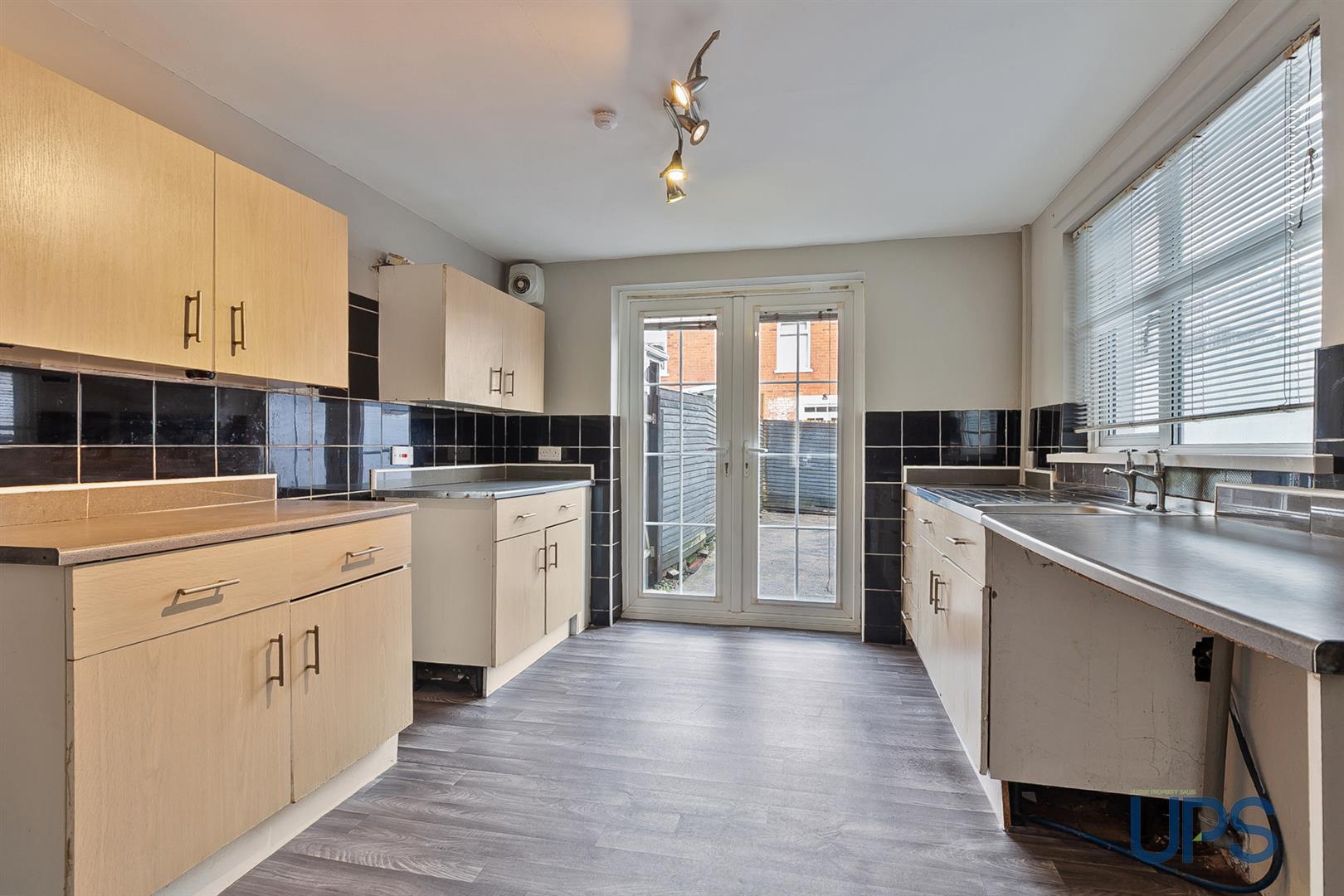 Fitted kitchen with double doors opening to a privately enclosed rear garden.