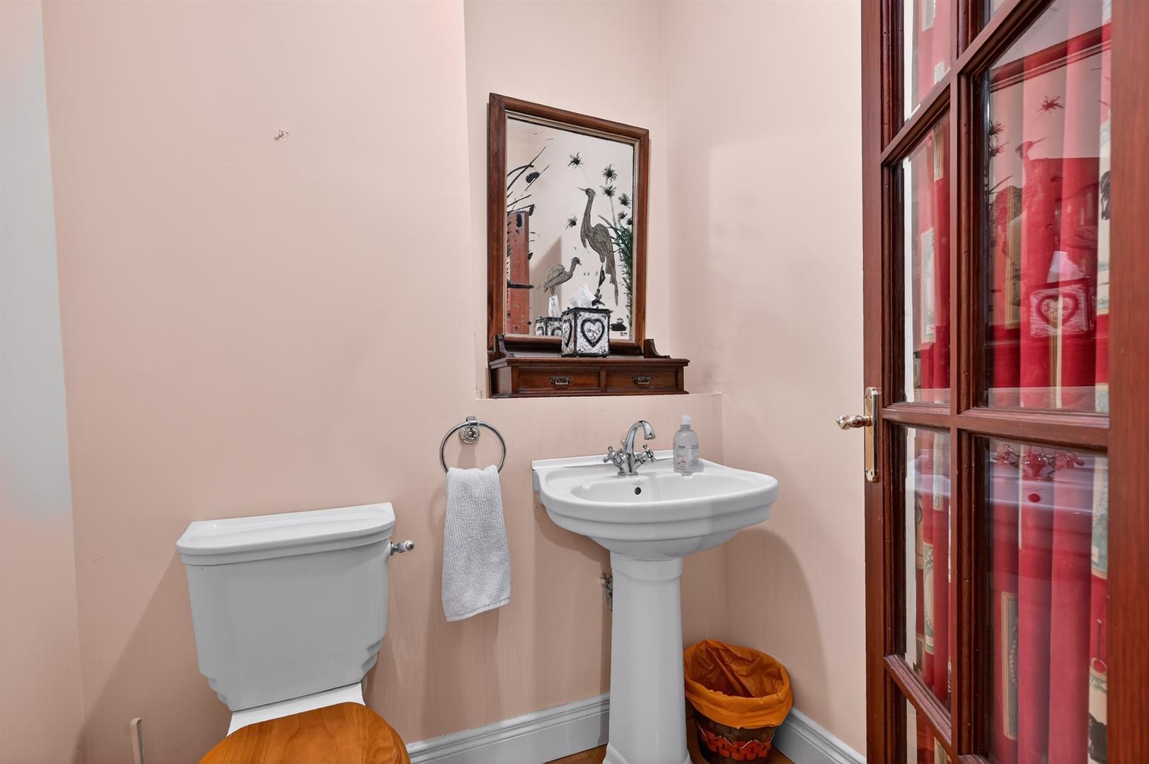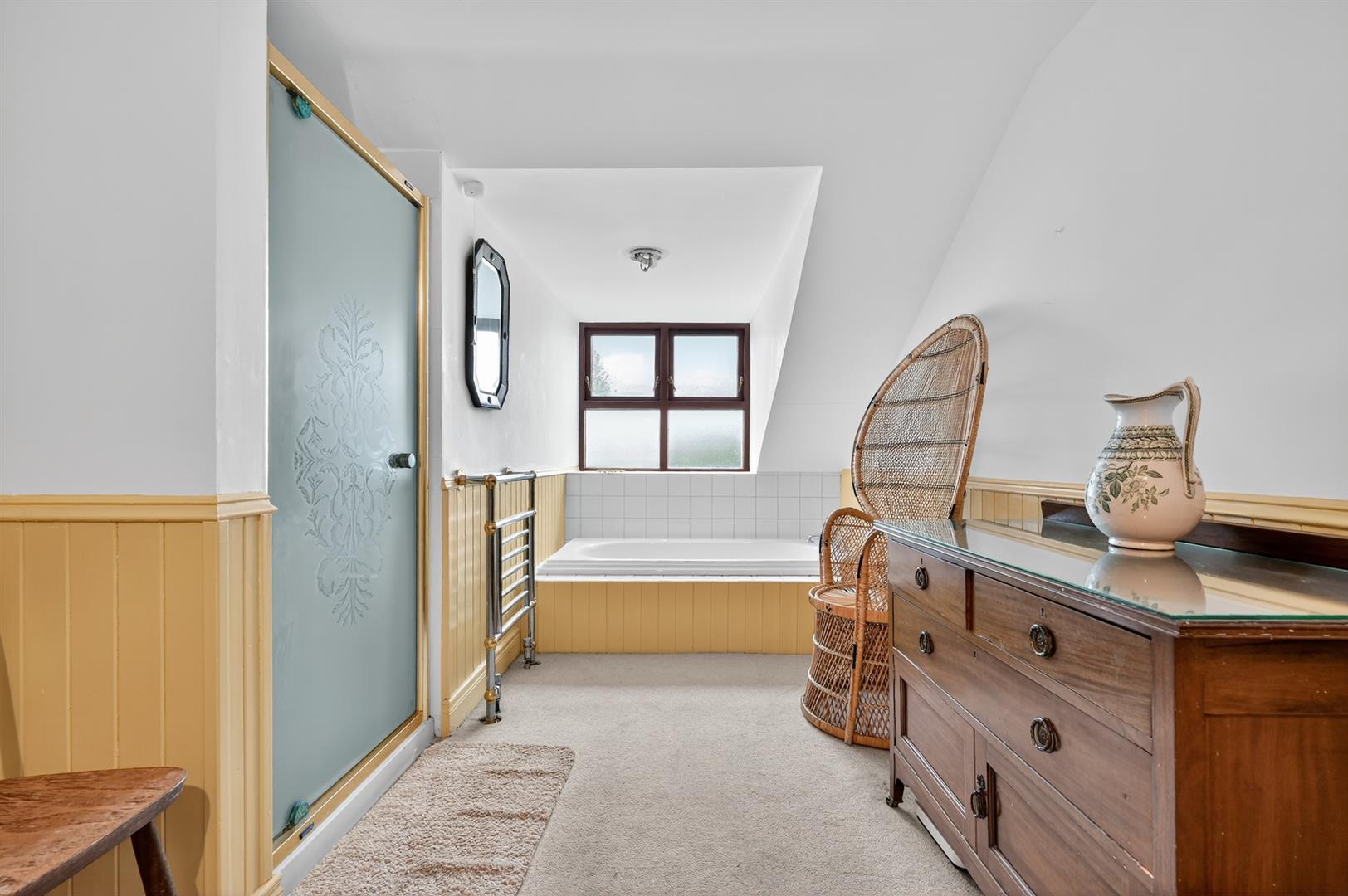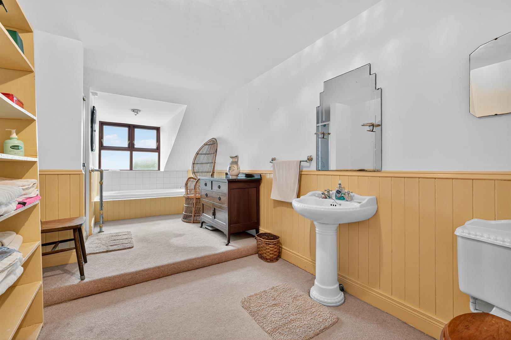 Tongue & groove panelled bath, walk in shower, pedestal wash hand basin, low flush W.C, part tiled walls.