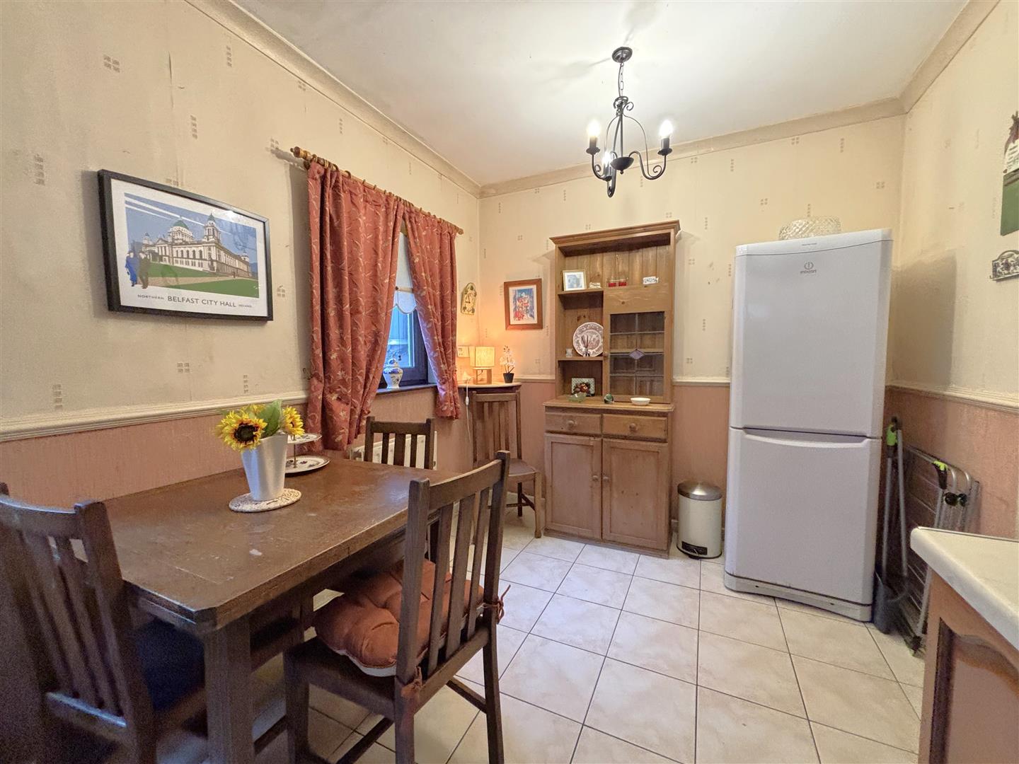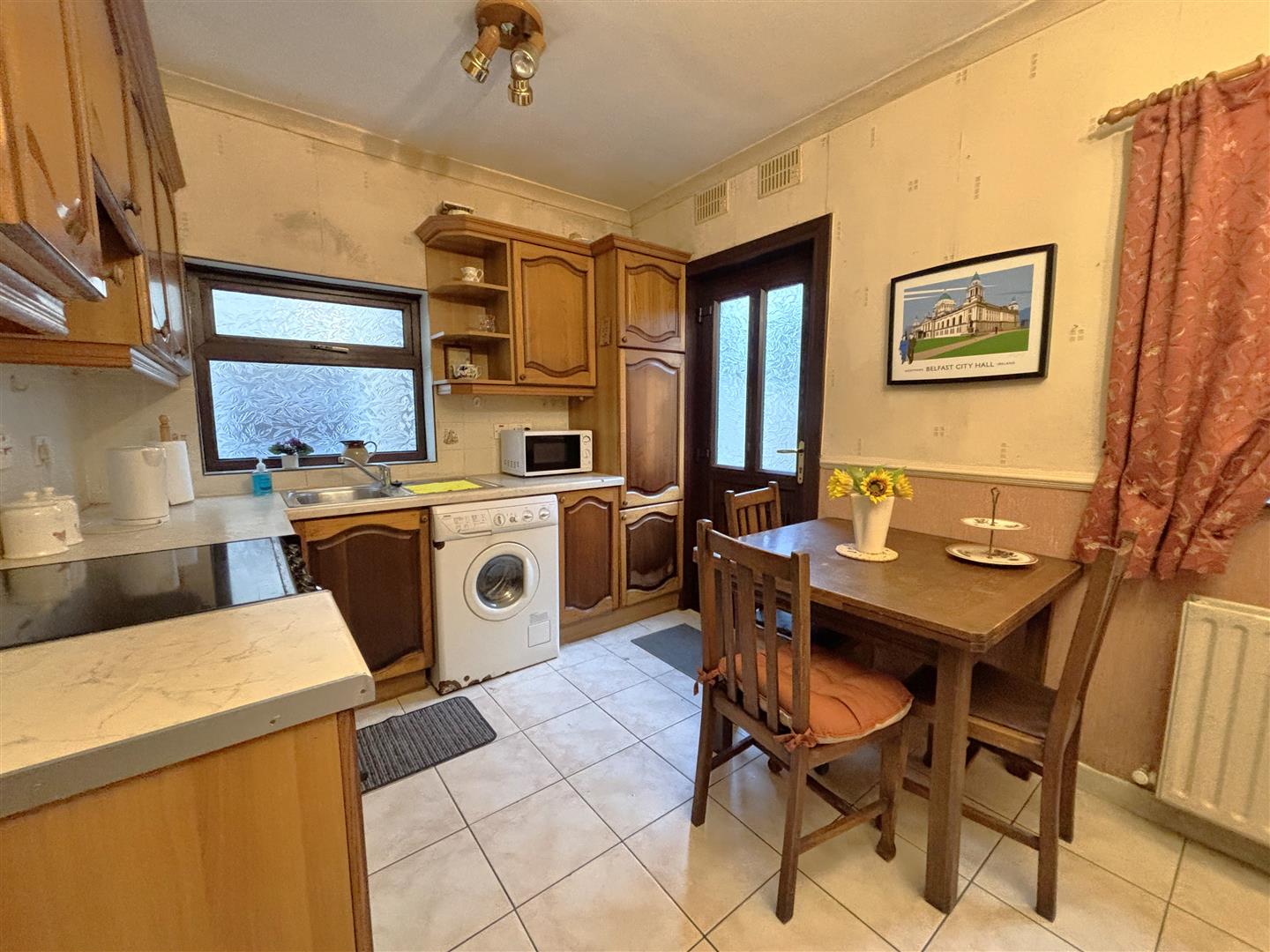 Single drainer stainless steel sink unit, range of high and low level units, formica worktops, cooker space, fridge/freezer space, plumbed for washing machine, partly tiled walls, double panelled radiator, ceramic tiled floor, uPvc door to rear.